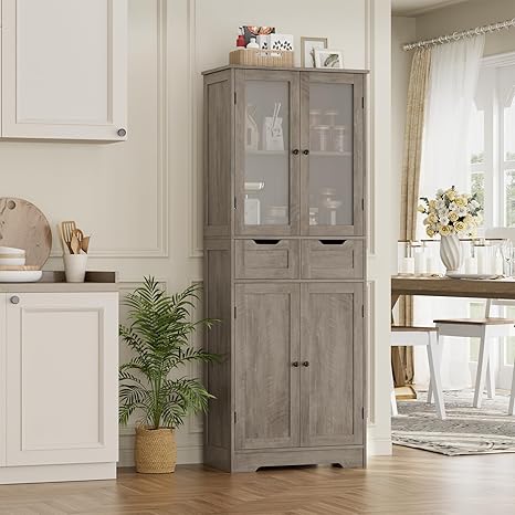 HOSTACK 64" Storage Cabinet, Tall Kitchen Pantry Cabinet, Modern Bathroom Storage Cabinet with Shelves | Drawers and Glass Doors, Free Standing Linen Cabinet Cupboard for Dining Room, Ash Grey