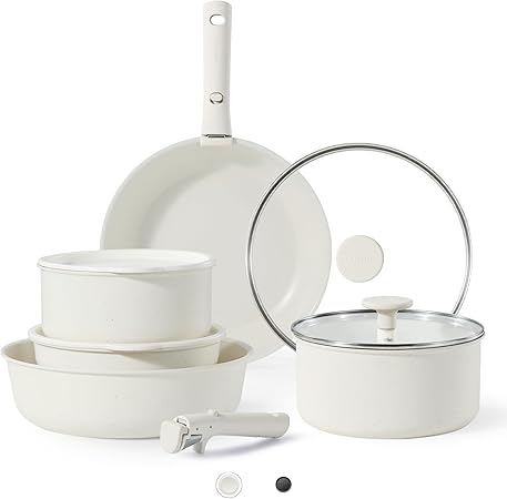 CAROTE Pots and Pans Set Non Stick, Cookware Sets, 11pcs Kitchen Set, Oven/Fridge Safe, Space Saving Pots Set, Nonstick Cooking Set with Versatile Detachable Handle, Induction RV Set, Cream White