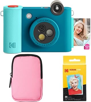 KODAK Smile+ 2-in-1 Digital Instant Print Camera & Wireless Bluetooth Photo Printer Starter Bundle + Soft Case + Zink 20pk Sticky-Back Photo Paper - 10MP, Special-Effect Rotating Lens - Blue