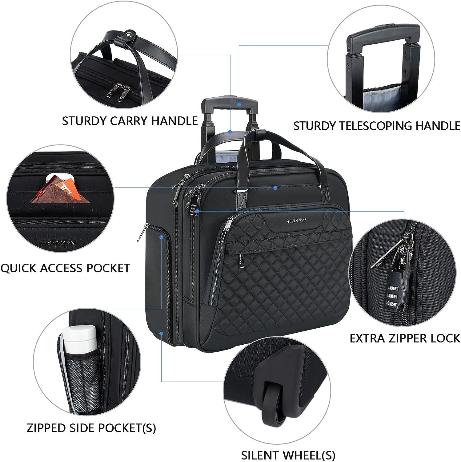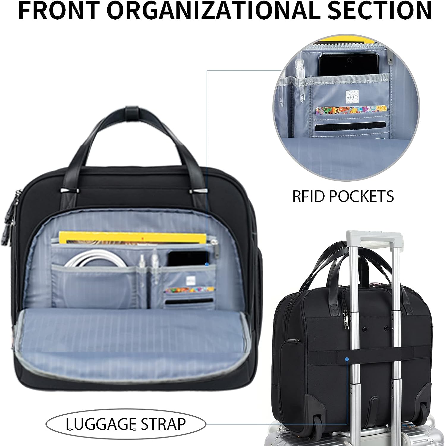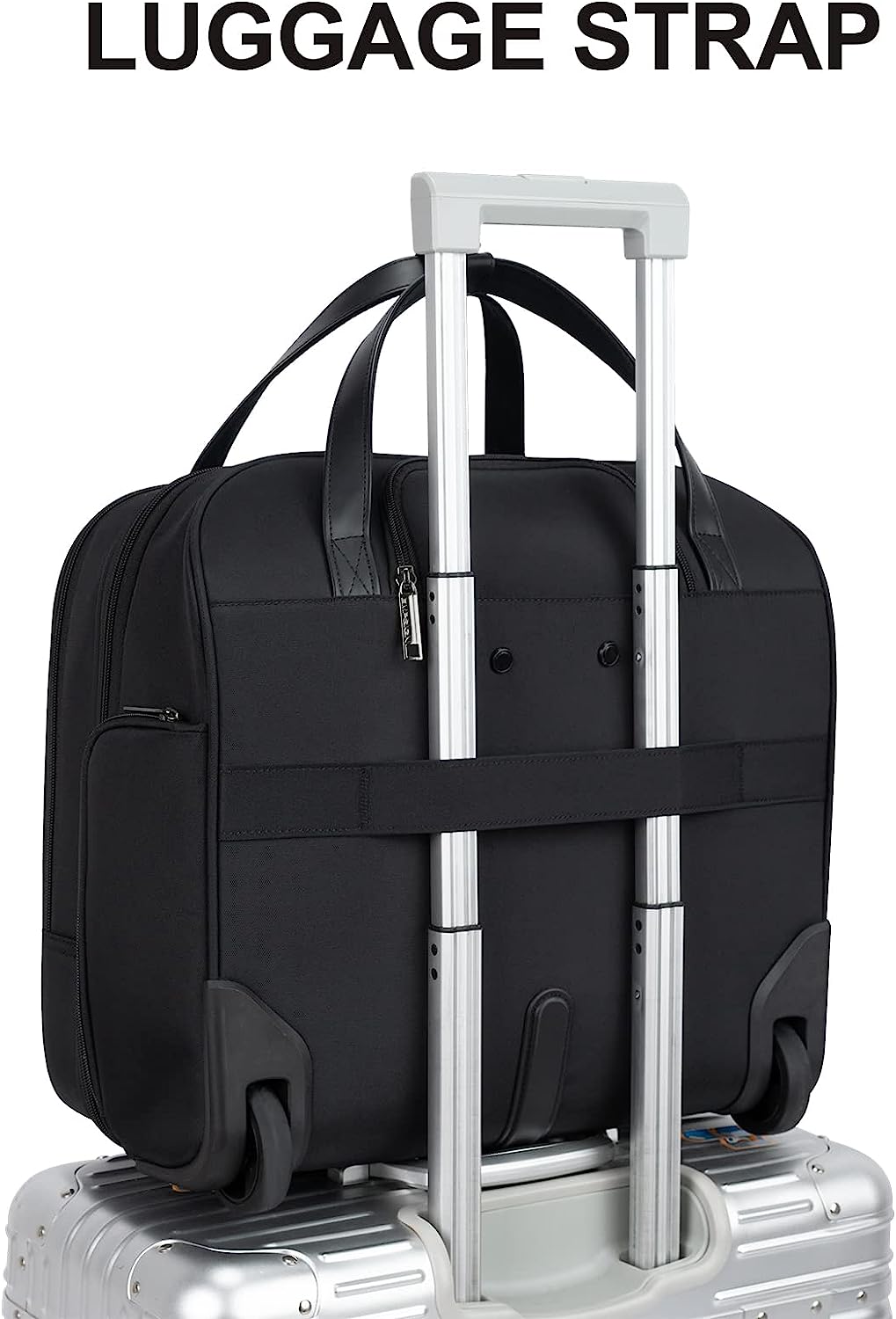 • EASY TO CARRY: The rolling laptop case has a leather grip, smooth zippers and waterproof bottom corner guards; retractable aluminum push-button handle and 2 silent rubber wheels make the briefcase roll effortlessly and more maneuverable. In addition, the rolling bag is equipped with a trolley strap on the back to securely fasten the bag to your luggage, making travel more comfortable.