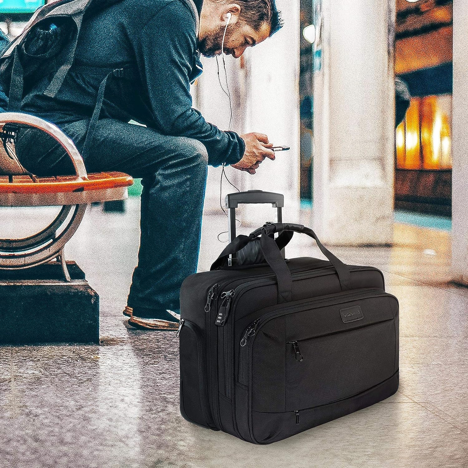 • CARRY ON & DURABLE DESIGN: Push button telescoping handle, quality silent wheels and lockable metal zipper heads allow for easy commute, business trip and travel. The telescoping handle retracts into a zippered compartment when not in use.