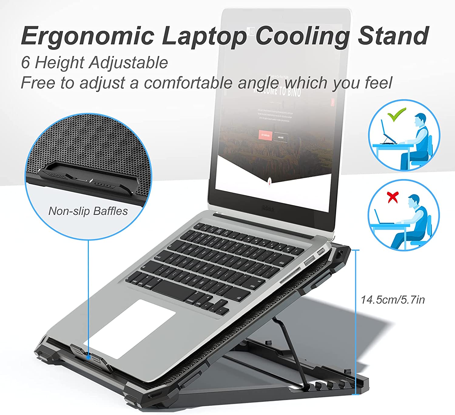 • ►【Ergonomic Laptop Cooler Stand】Five adjustable height settings to put the stand up or flat and hold your laptop in a suitable position. Two baffles prevent your laptop from sliding down or falling off; It's not just a laptop Cooling Pad, but also a perfect laptop stand.