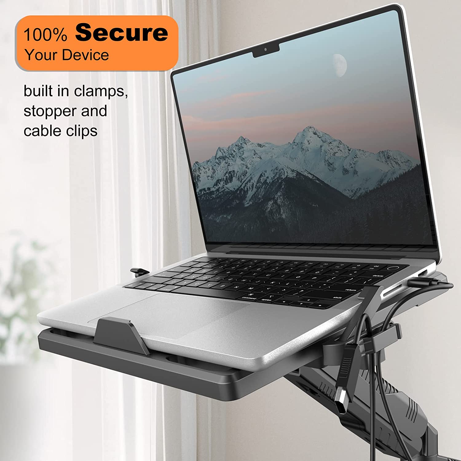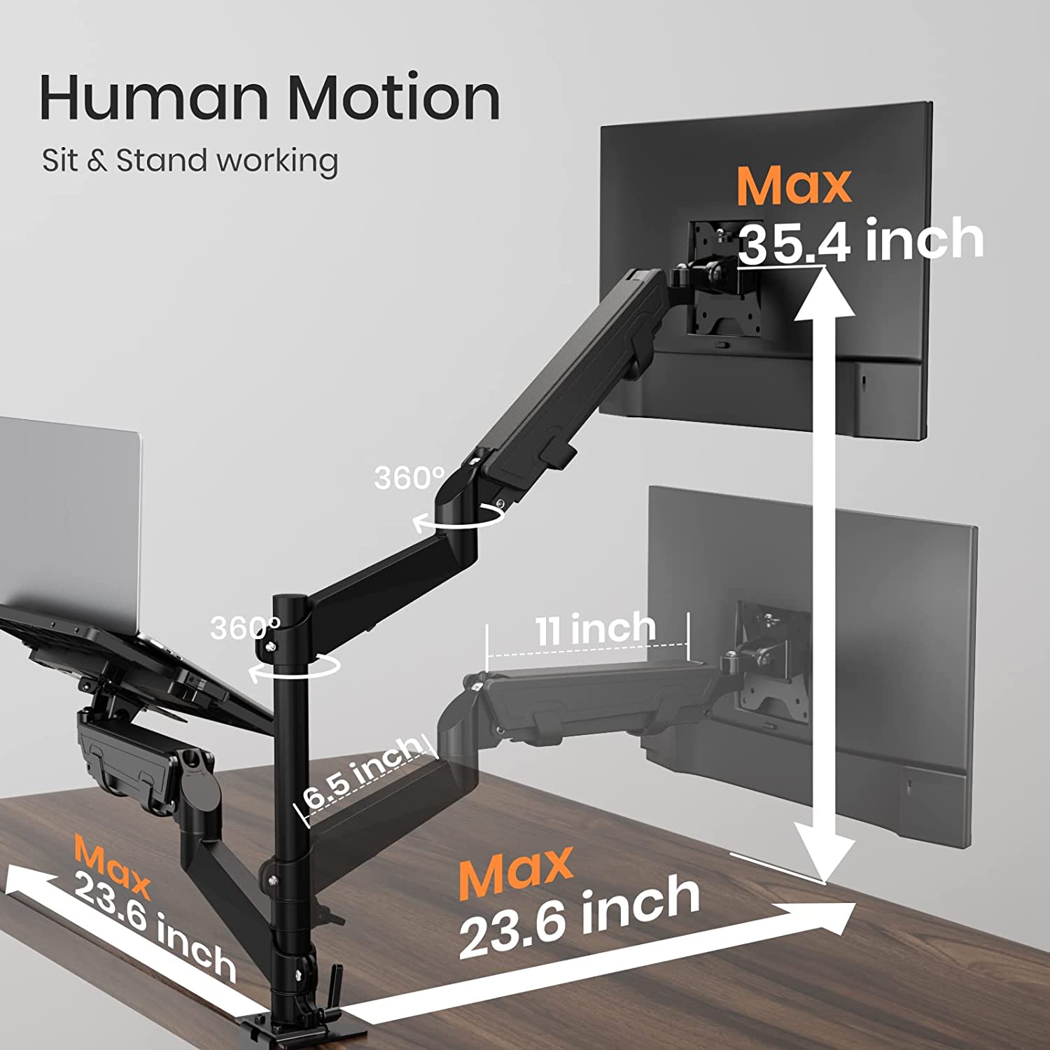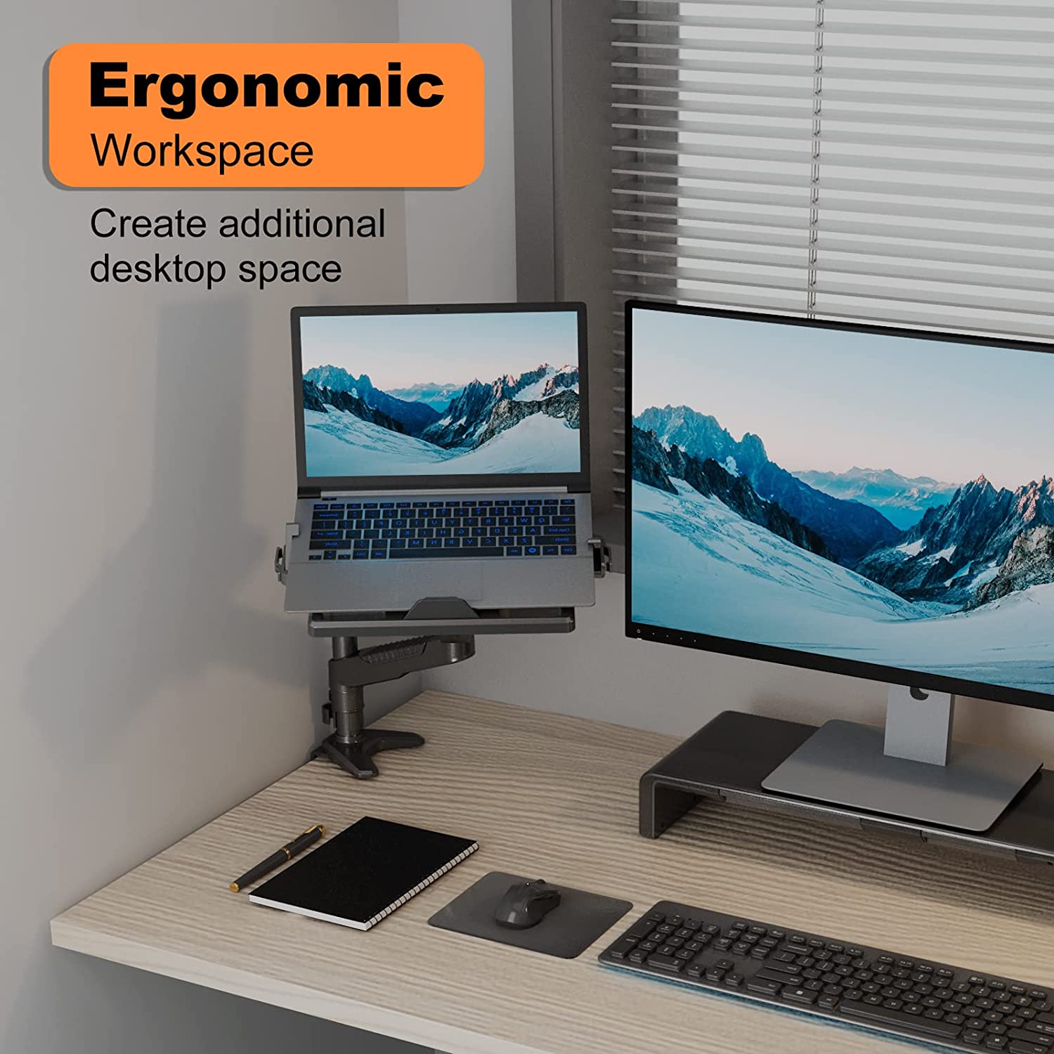 Gas Spring Laptop Mount with Adjustable Tray - Klearlook 2in1 Full Motion Monitor Laptop Stand Mount,Fully Adjustable Extension Arm Mount with 75x75/100x100mm VESA Plate,Clamp-on and Grommet Mounting