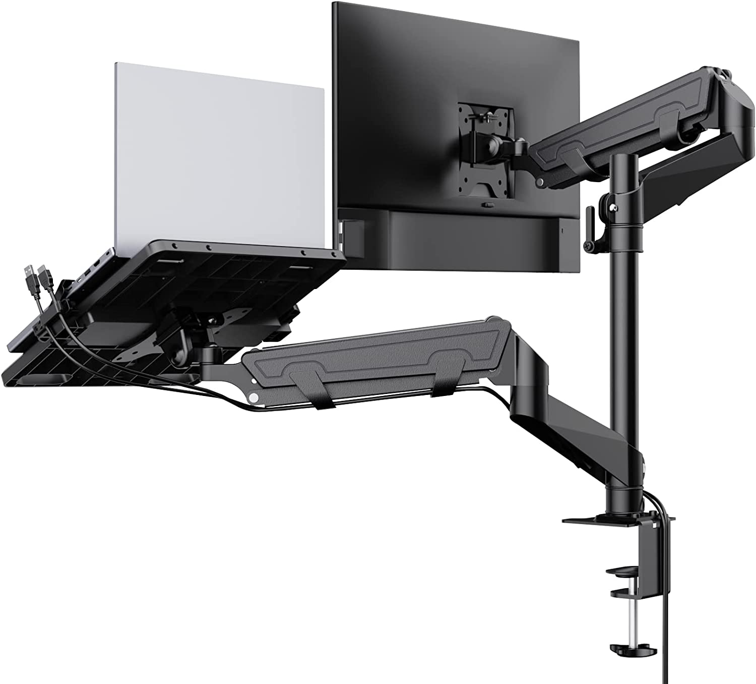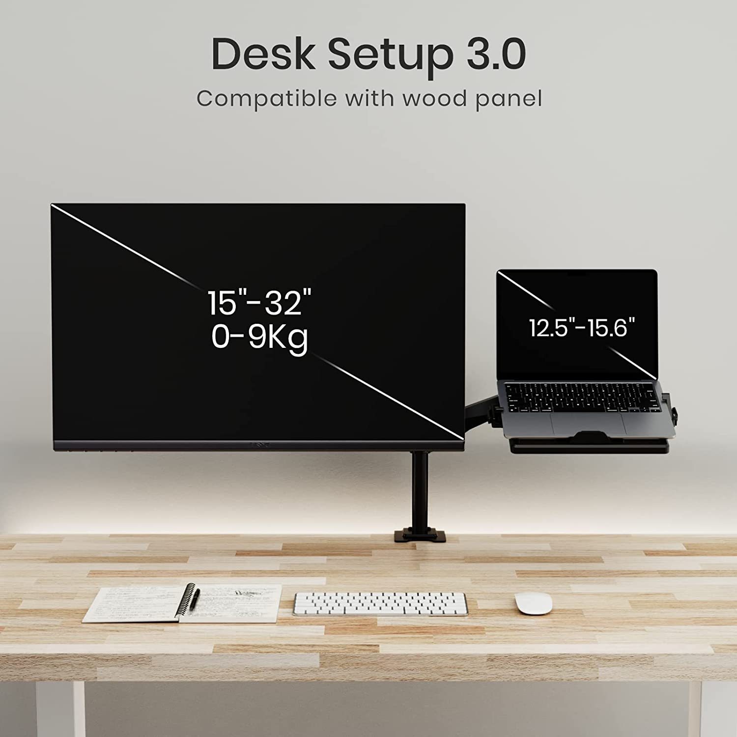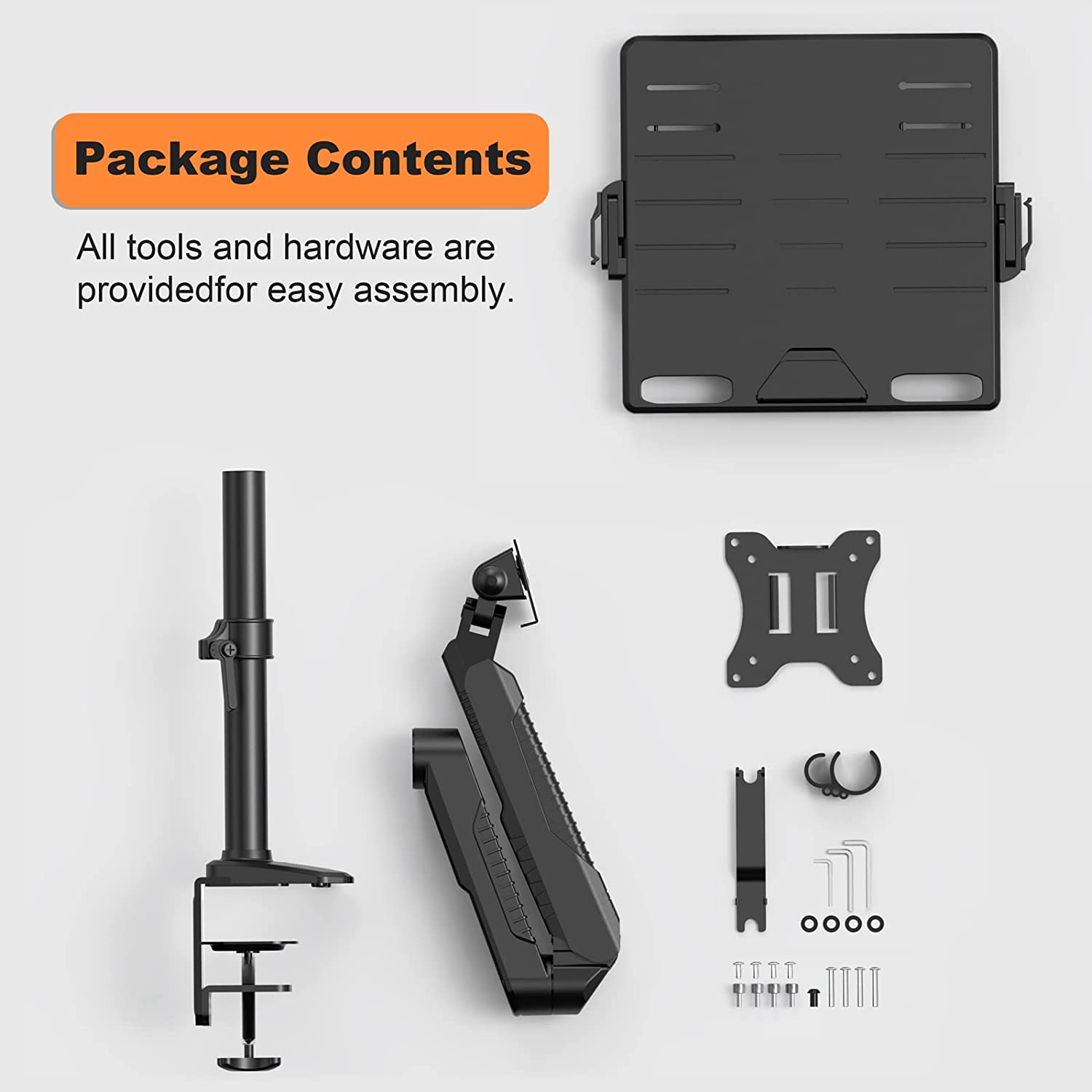 Gas Spring Laptop Mount with Adjustable Tray - Klearlook 2in1 Full Motion Monitor Laptop Stand Mount,Fully Adjustable Extension Arm Mount with 75x75/100x100mm VESA Plate,Clamp-on and Grommet Mounting