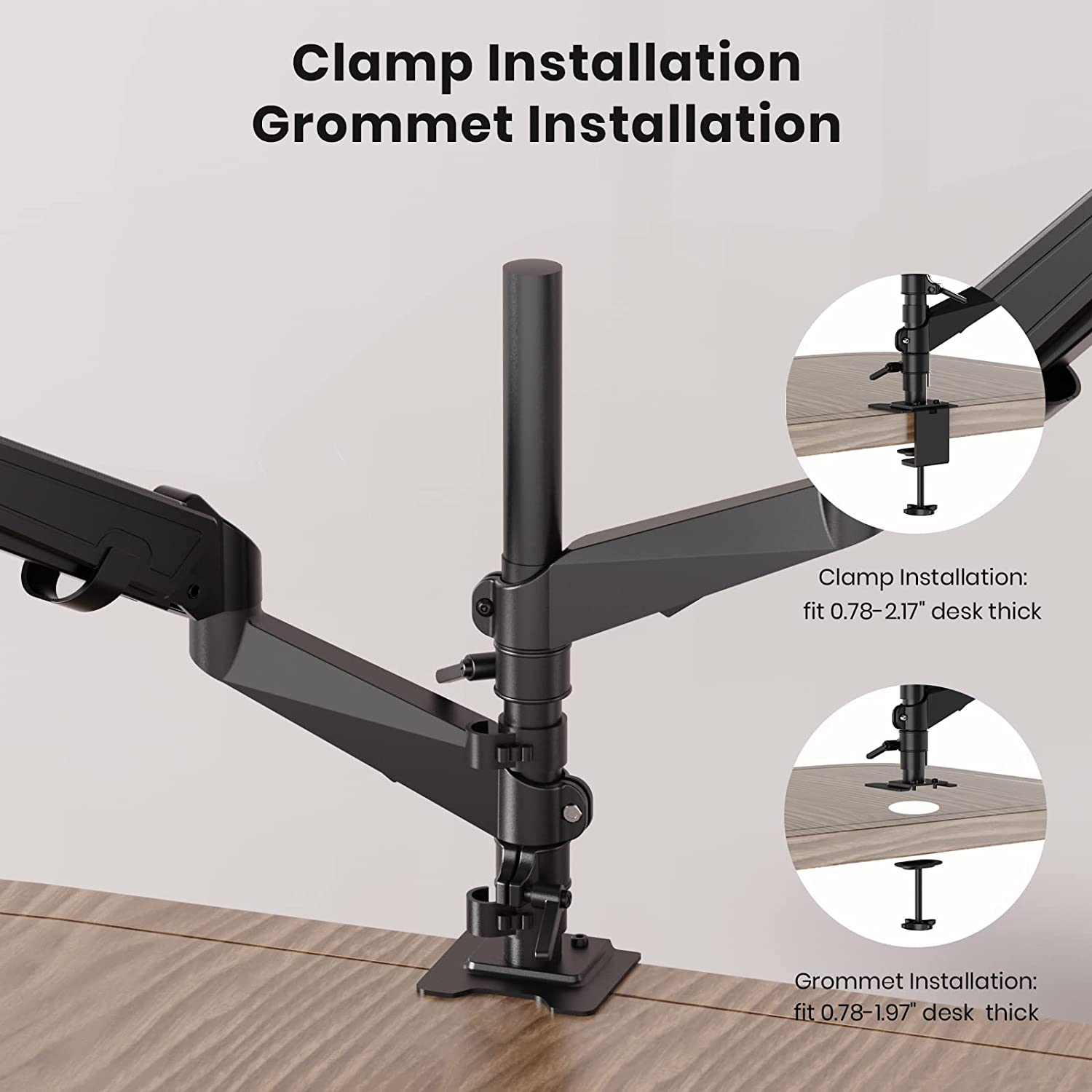 • 【Multiple Installation Options】this monitor laptop riser arm offer clamp and grommet mounting( C-Clamp allows the thickness of the table up to 3.35 inches and Grommet-Base maximum supports 1.6’’ diameter desktop cable grommet hole). All tools and hardware are provided for easy assembly.