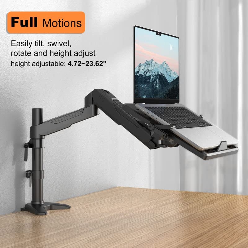 • 【Full Motion and Height Adjustable】The desk laptop arms easily tilt, swivel and rotate (swivel: -90°/+90°, rotate: 360°, tilt: -90°/+85° and height adjustment along the center pole). The wide adjustable range make it a breeze to set your own comfortable workstation and switch between standing and sitting posture.