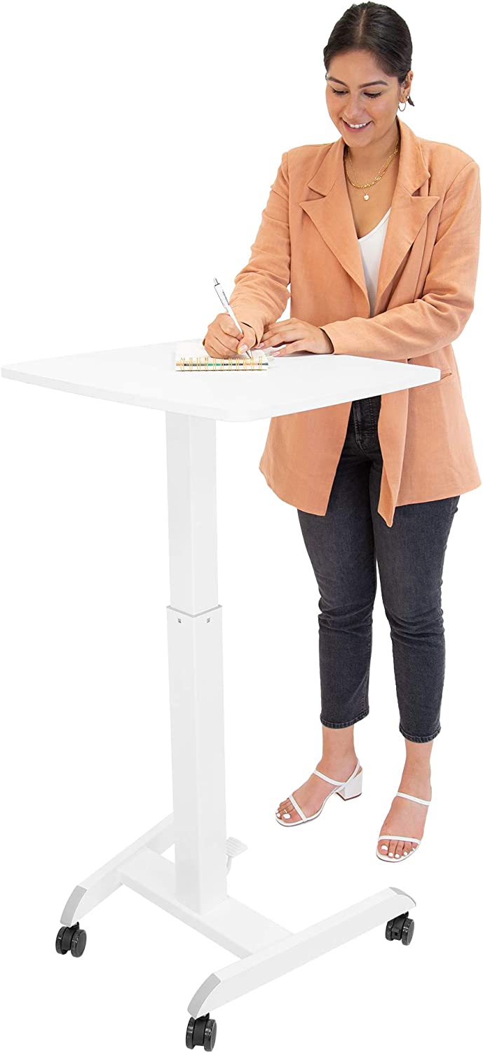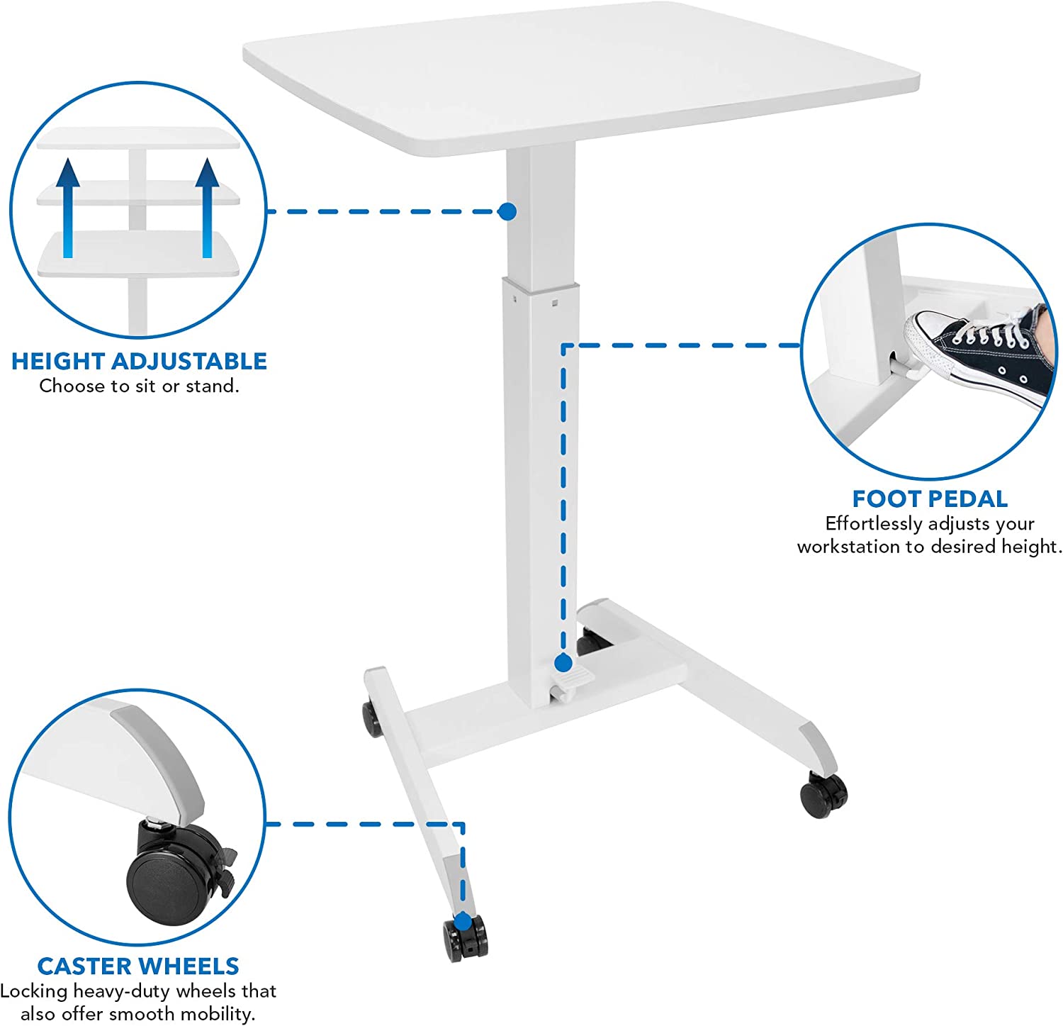 Mount-It! Adjustable Rolling Laptop Desk with Wheels [23.6" x 20.5"] Sit Stand Mobile Workstation Cart with Pneumatic Spring Lift for Height Adjustment, Rolling Computer Table, Foot Pedal (White)