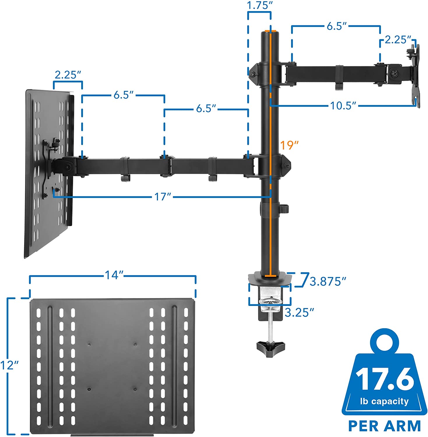 • Dual Monitor and Laptop Mount holds laptops that weigh up to 17 pounds. Monitor attachment holds large screens from 17-32 inches WITHOUT sagging. VESA Compatible with 75x75, 100x100