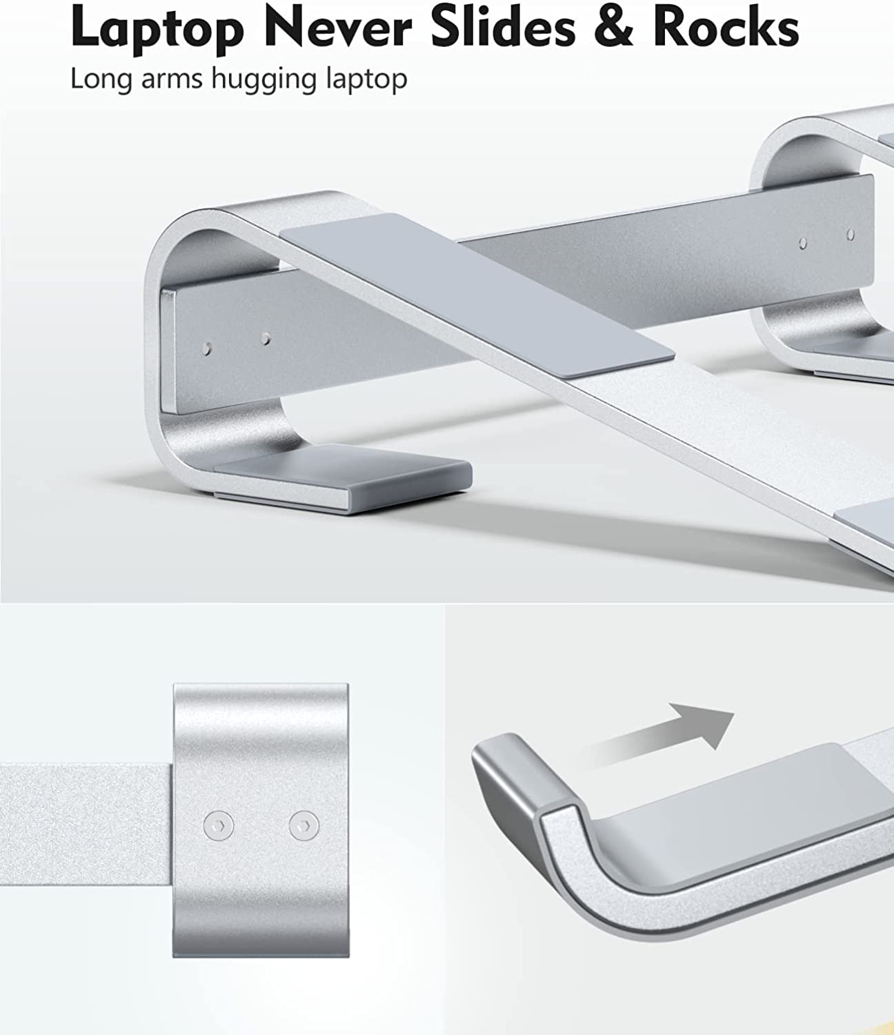 • 【 Laptop Never Slides & Rocks】 - This laptop stand is simple. Its rubber inlets prevent it from sliding around;Desk laptop stand tilts at a perfect angle to protect your wrist and maintains your neutral posture. High-quality aluminum protective hook and rubber anti-skid pad ensure smooth typing without the need to worry about the laptop sliding and "rocking" back and forth.
