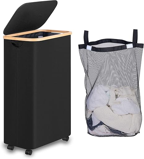75L Slim Laundry Hamper with Wheels, Clothes Hamper for Laundry, Laundry Basket with Lid & Inner Bag, for Laundry Room, Bedroom, Dormitory Organization, Black