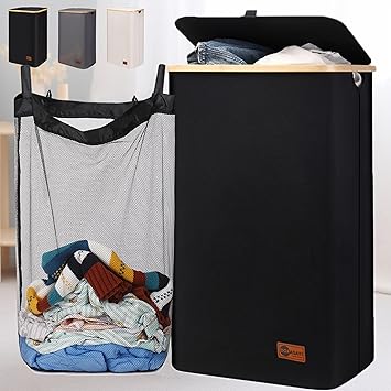 DOFASAYI Laundry Hamper with lid - 120L XL- Large Laundry Basket with Bamboo Handles, Portable Clothes Hamper for Dorm Room, Bathroom, bedroom, Grey foldable Hamper for Toys, closet, Clothing, Black