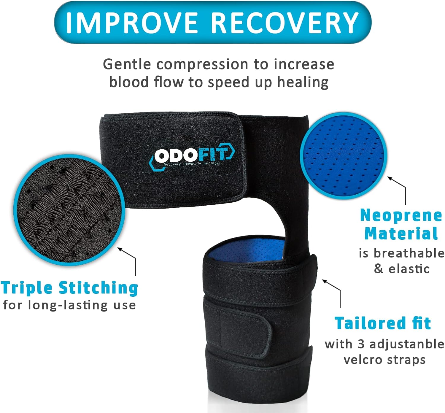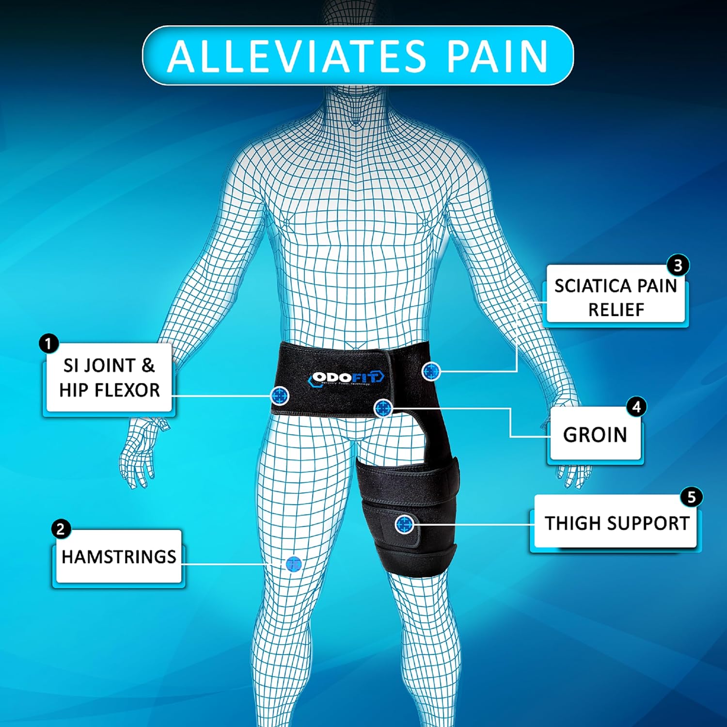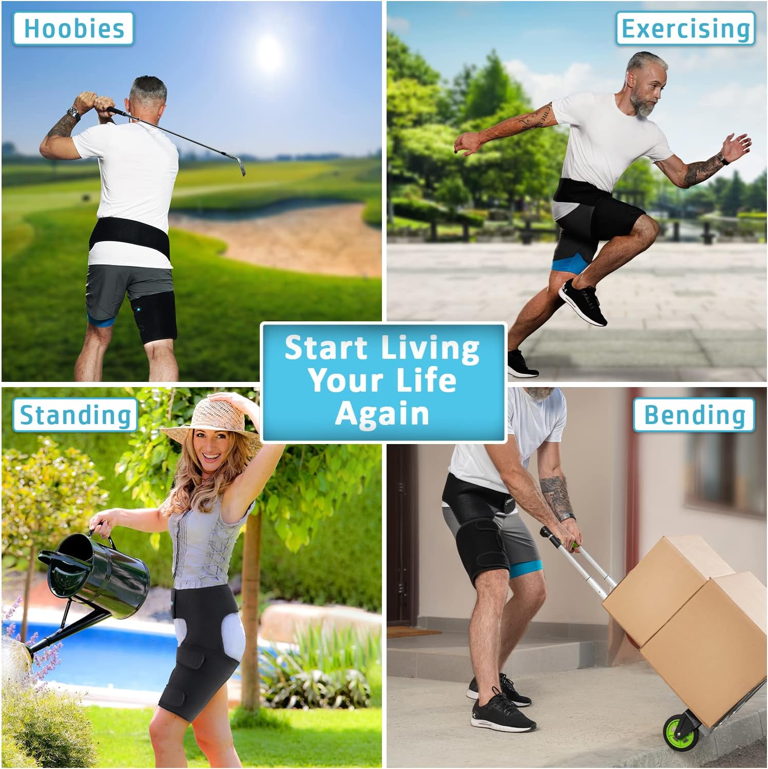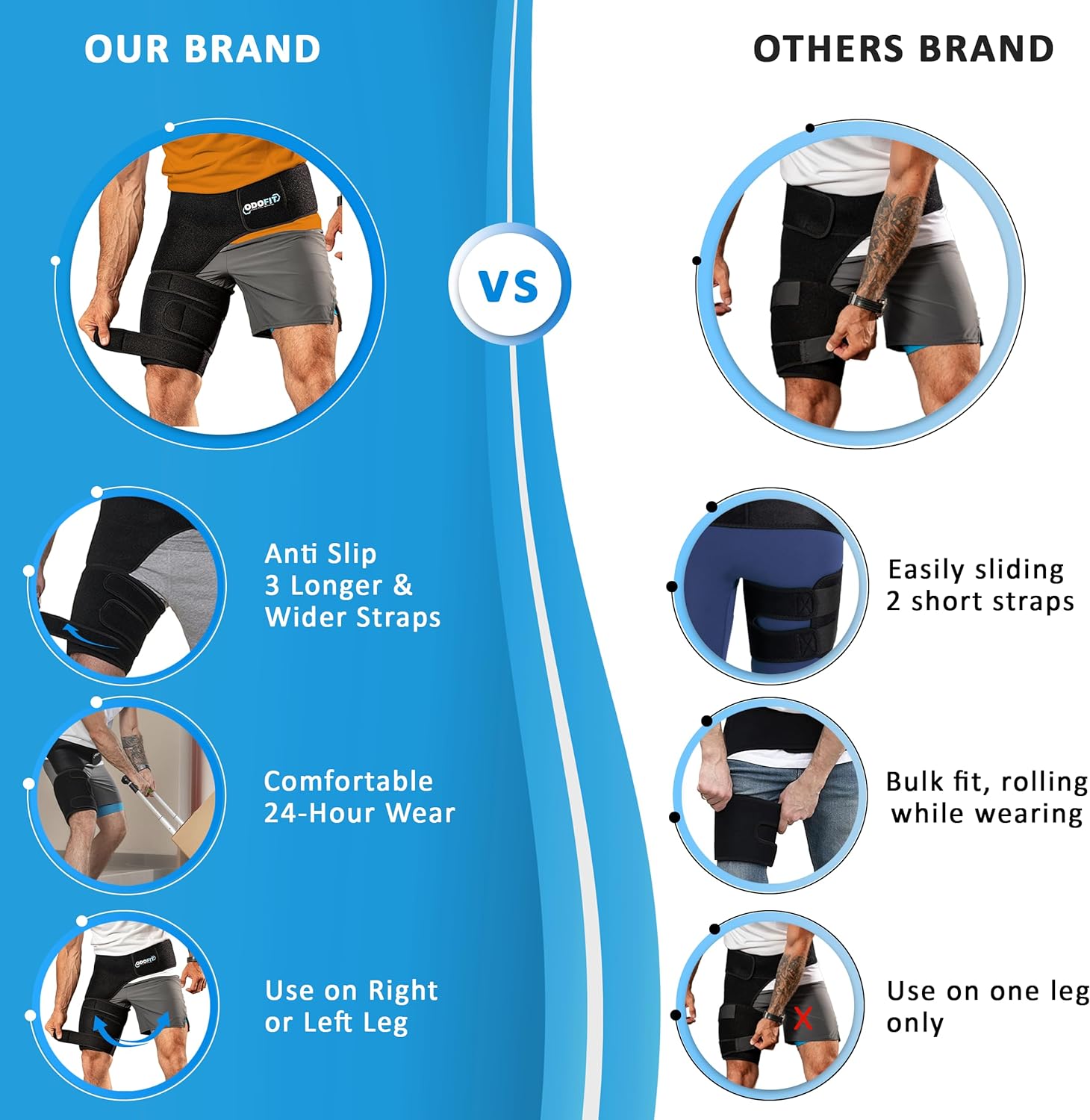 • INJURY SUPPORT: Our compression wrap is designed to enhance your mobility and reduce muscle tension. The thigh wrap's snug fit provides stability, warmth, and improved blood flow, leading to a faster recovery time and less pain from any hip arthritis and hamstring tendonitis