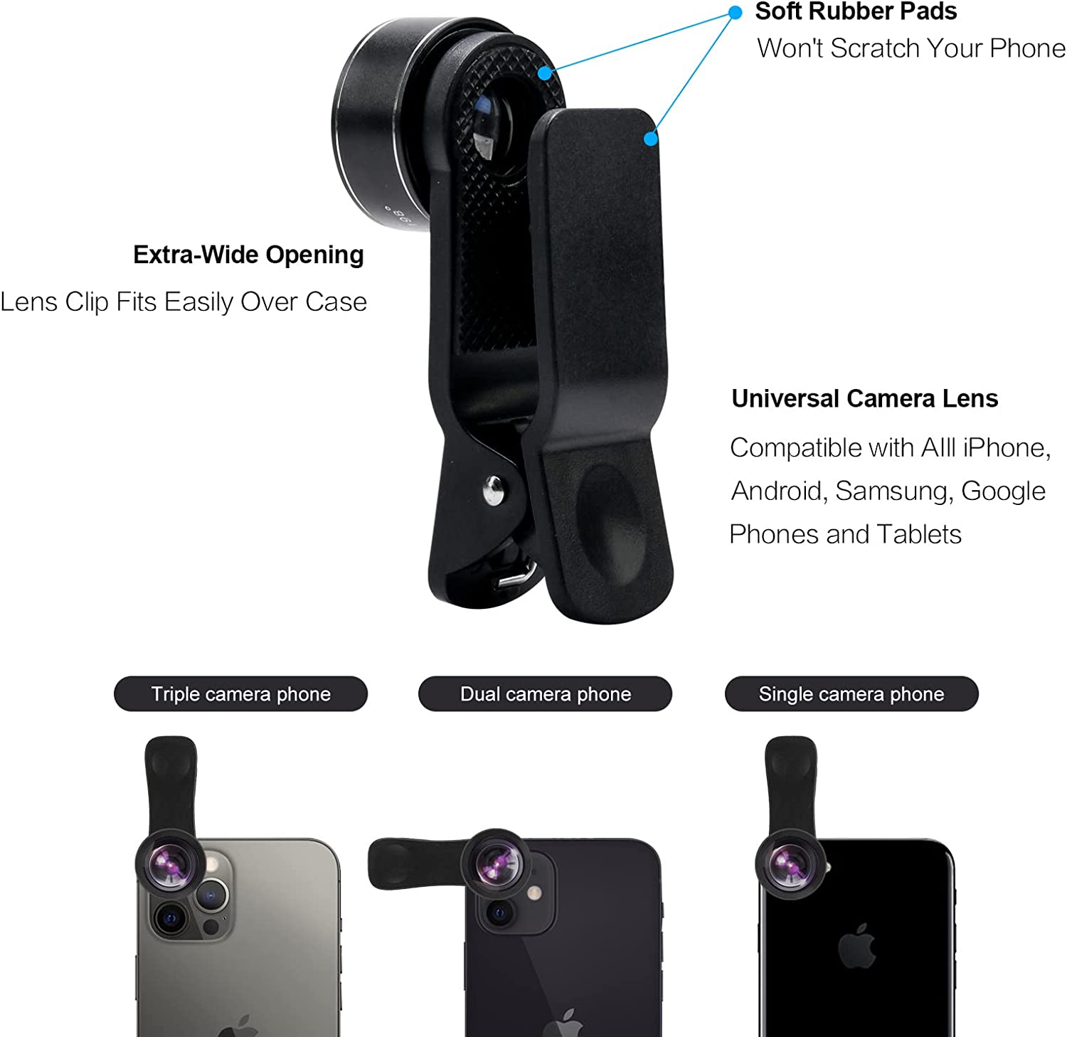 • Portable and detachable universal lens clip design: Compatible with almost any smartphone including (but no limited to) iPhone 14, 13, 12, 12 Pro, 11, Xs, X, 8, 7, 6s, 6 plus, Samsung galaxy / note, iPads, Android Tablets, Huawei, HTC, LG G6 G5, Motorola, Sony, and many others. The lens works on both front-facing and rear-facing cameras