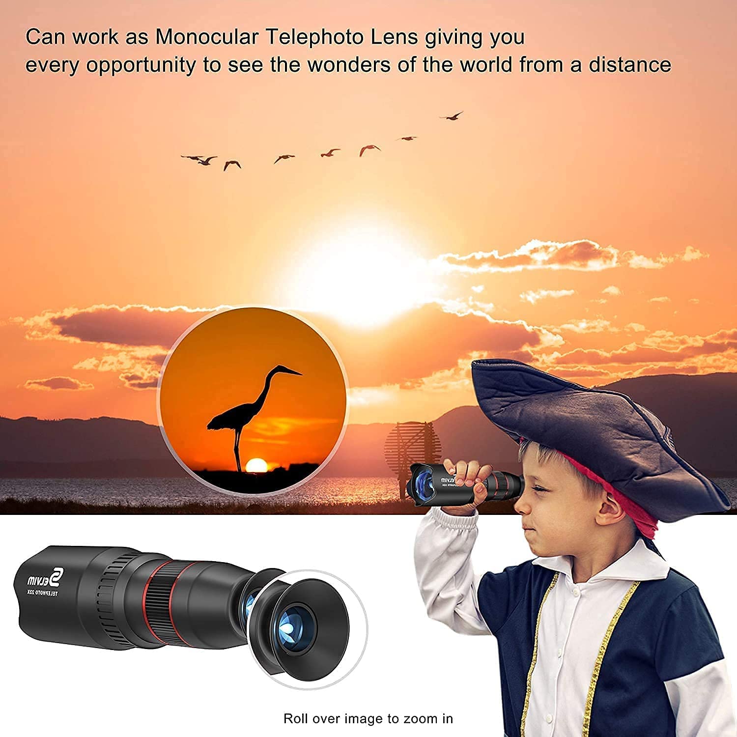 • 【Expand Your Phone's Picture-taking Capabilities】 22X telephoto camera lens - Magnify distant subjects and zoom in for vivid close-up shots; 235° fisheye lens - Create fun and unique circular mystical result picture; 25X macro lens - Capture all the intricacies and details with precision-focus for razor crisp macro photos (Not for zooming in on distant object); HD 0.62X super wide angle lens - Capture a wide field of view for stunning perspectives with virtually no distortion.