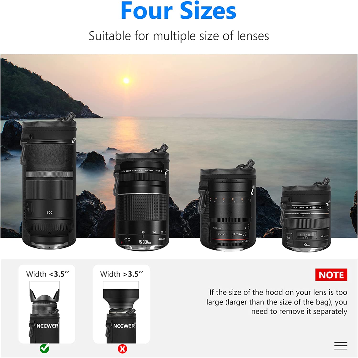 • 【4-Pack Lens Case】 Comes with small, medium, large and extra large neoprene lens cases for DSLR and mirrorless camera lenses