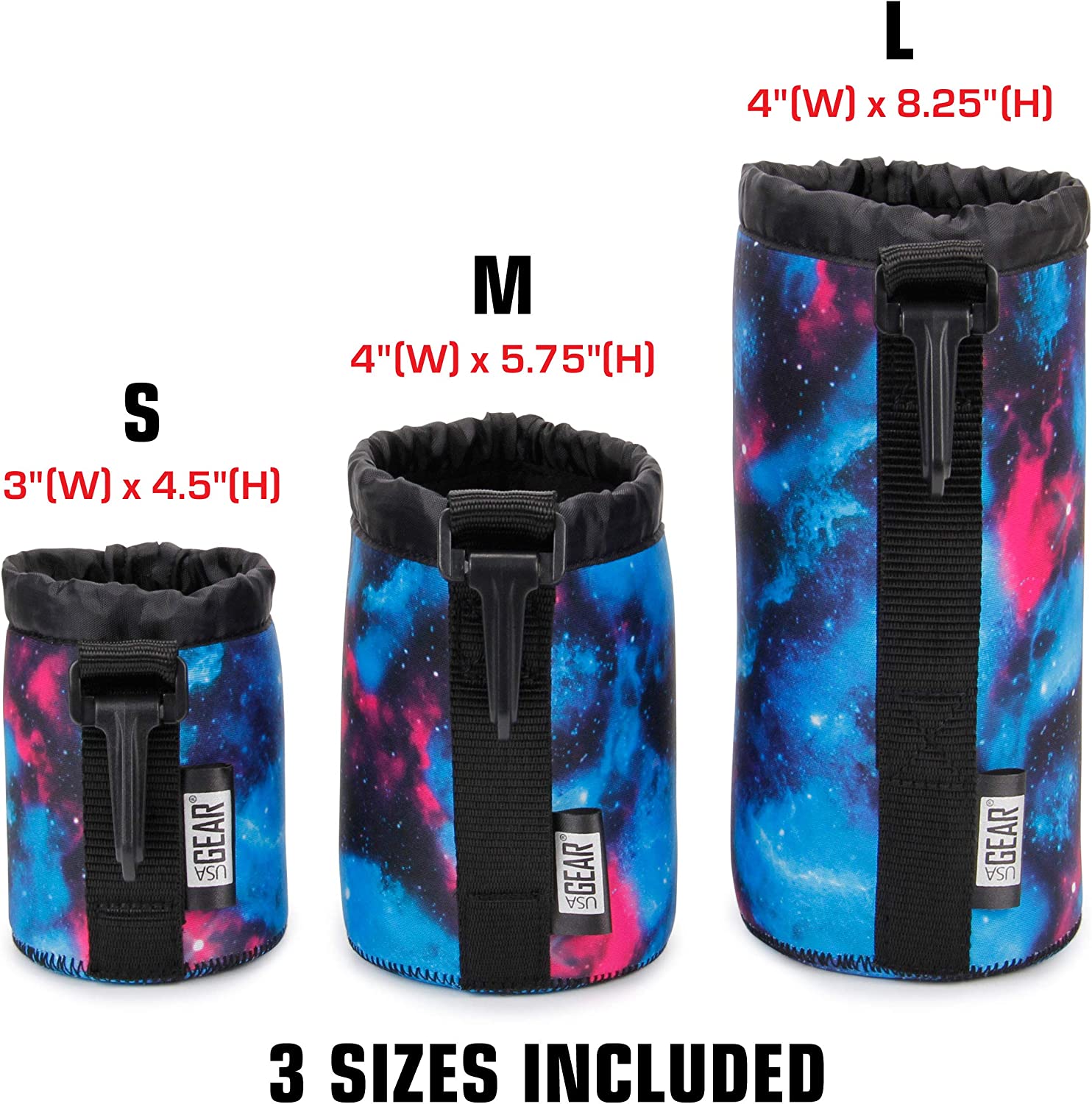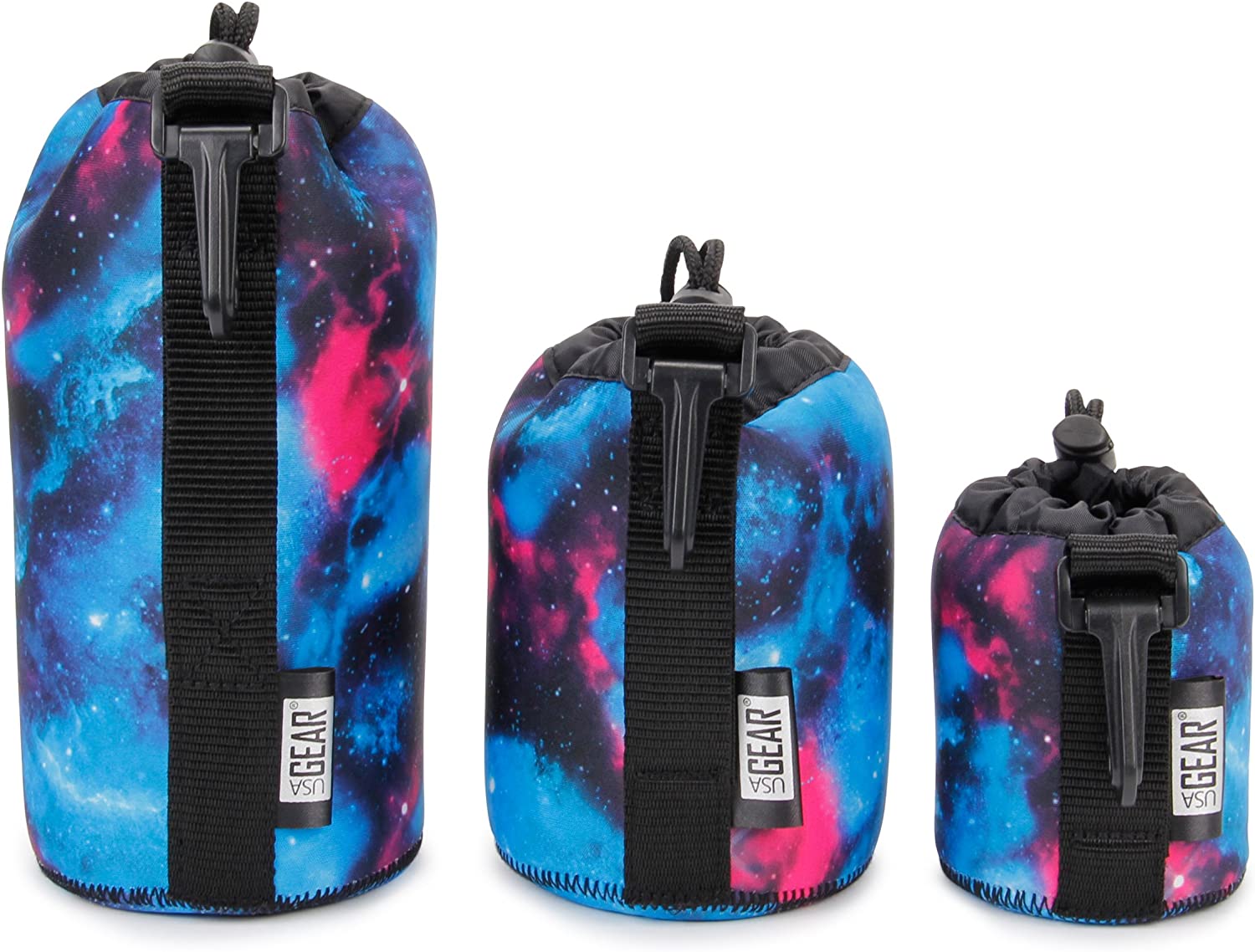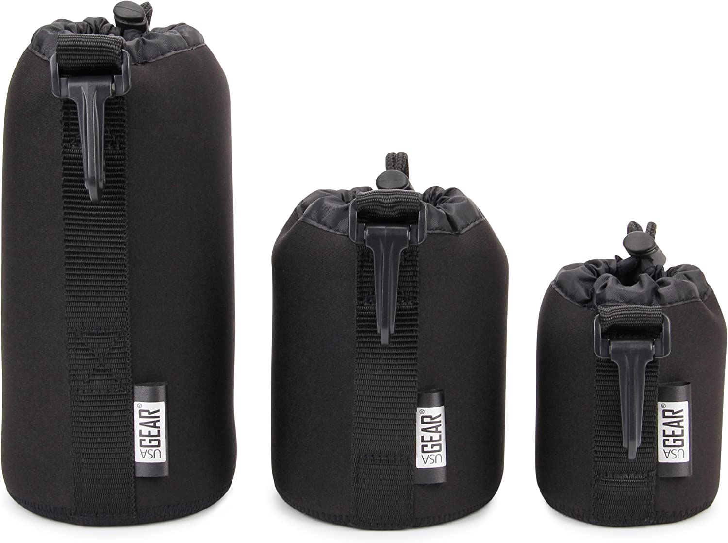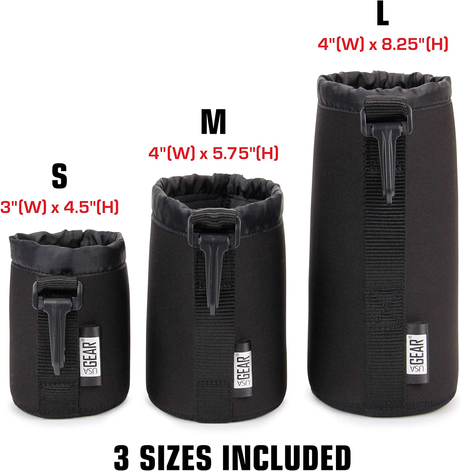 USA GEAR FlexARMOR Protective Neoprene Lens Case Pouch Set 3-Pack - Small, Medium and Large Cases Hold Lenses up to 70-300mm with Drawstring Opening, Attached Clip, Reinforced Belt Loop (Black)