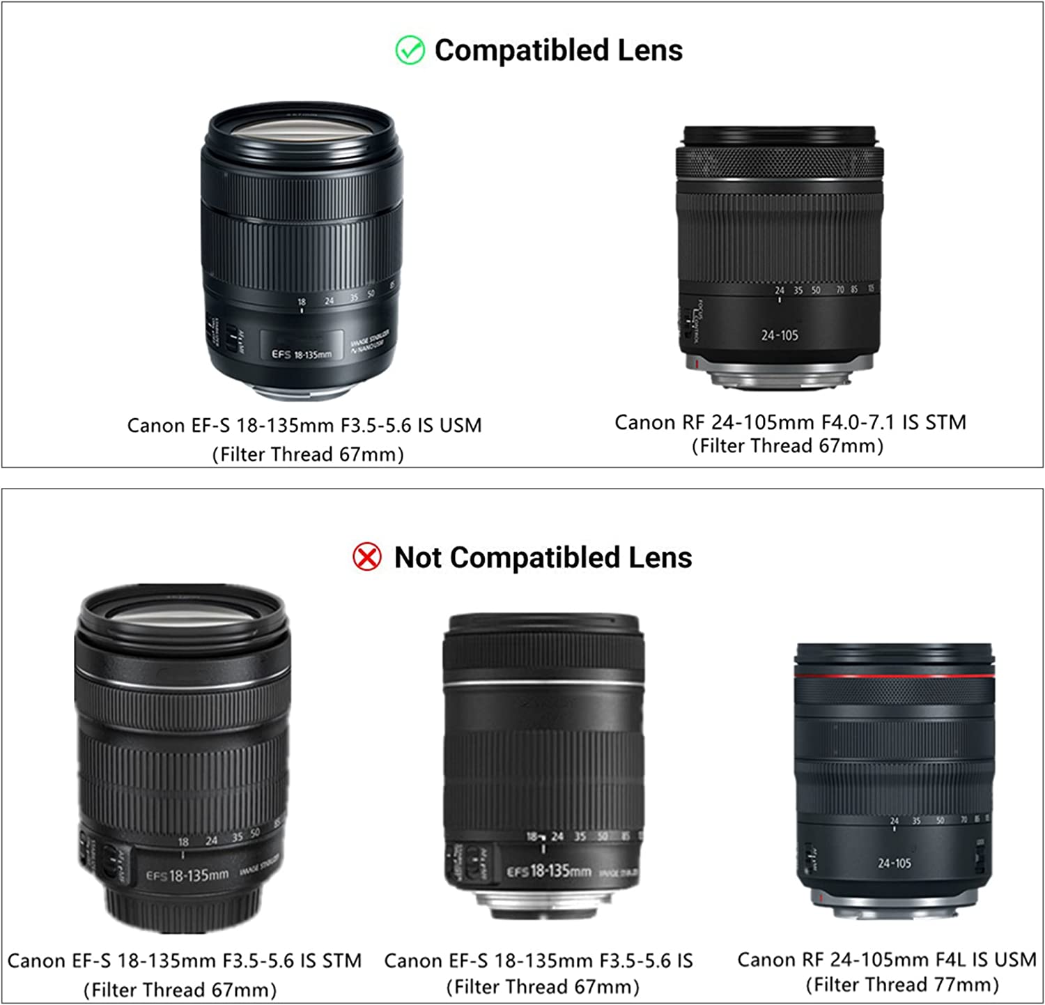 • Compatible Lens 2 : Canon RF 24-105mm F4-7.1 IS STM (Does Not fit RF 24-105mm F4)