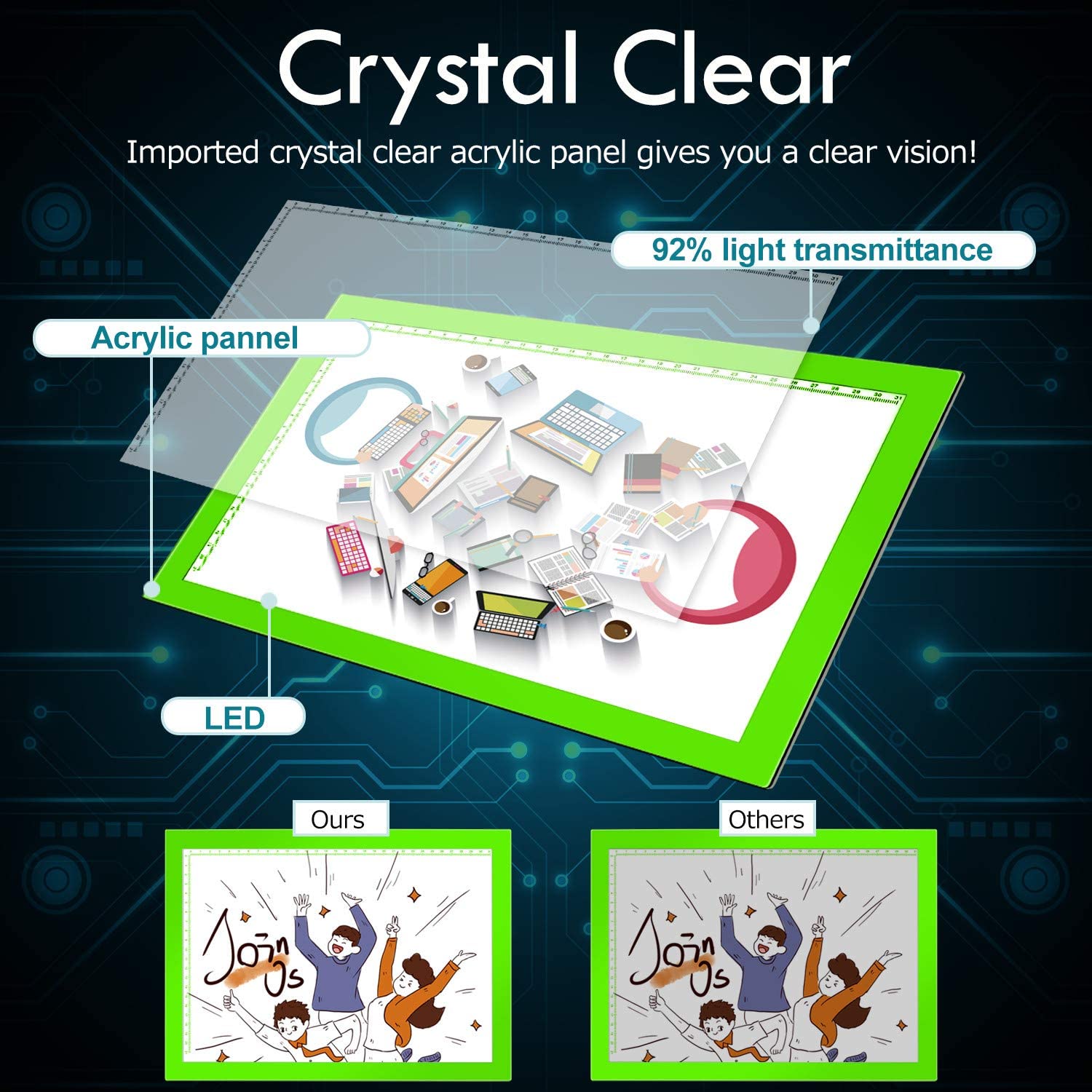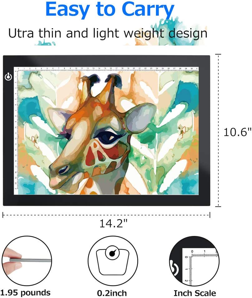 • EASY CARRYING -- Light weight super slim light pad, thickness only 0.2’’, about 5mm. Overall dimension including frame is L14.2’’xW10.6’’xH0.2’’. The visual working area is 9’’x12’’.