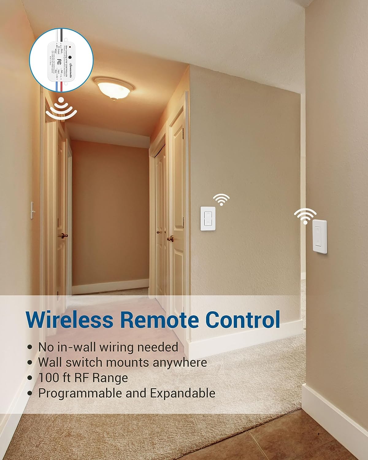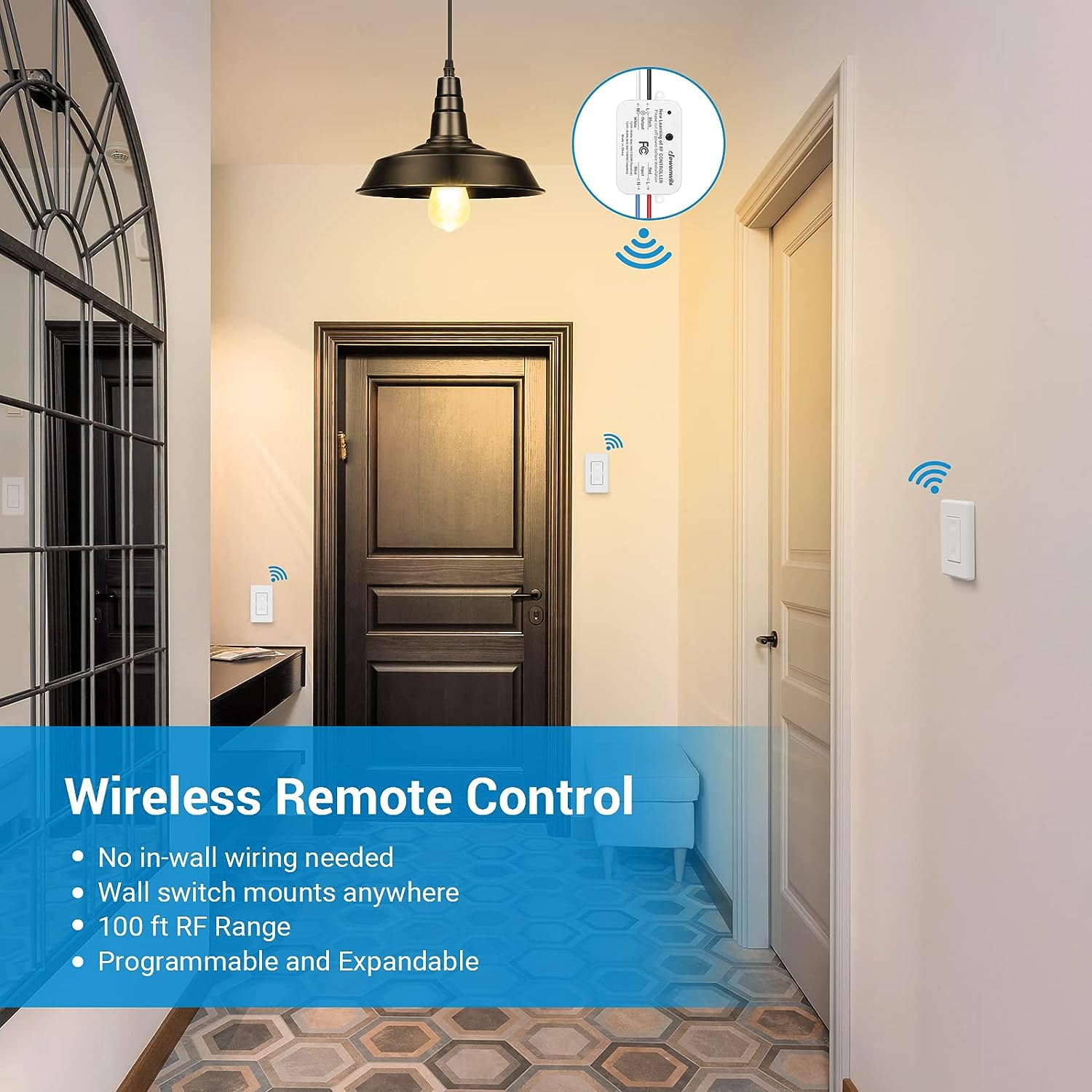 • 【 Programmable and Expandable 】 Available to add more wall switches, receiver kits, extra handheld remotes, outlets and light sockets (Same Model Only); transmitter wall switch and receiver have been pre-programmed for immediate use