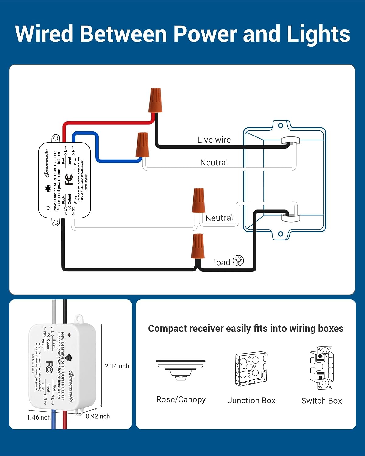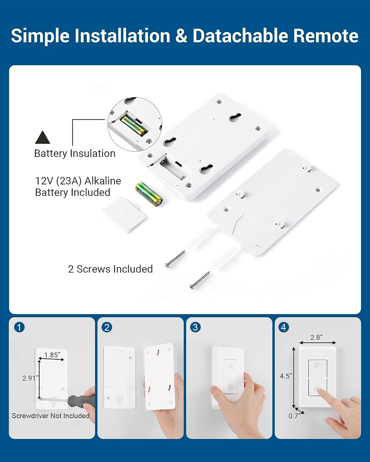 • 【 Detachable Wall Switch and Compact Receiver Kit 】 Mounting bracket provided; white RF remote control wall mountable switch mounts anywhere; compact receiver switch kit fits limited space like rose/canopy, electrical junction box, switch box