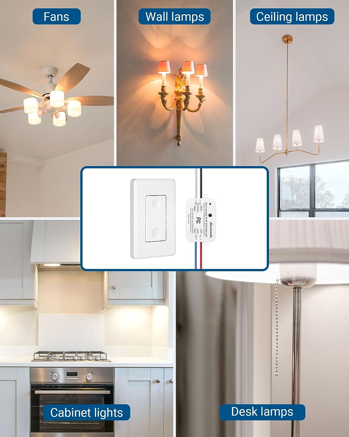 • 【 Widely Used with Multiple Appliances 】 1 Switch controls a group of lights (1000W tungsten / 600W fluorescent / 200W LED); remotely turn on/off indoor lighting fixtures, ceiling lights, plug-in pendant, lamps, hard-to-reach lights, and other electric appliances with a push of a wall switch