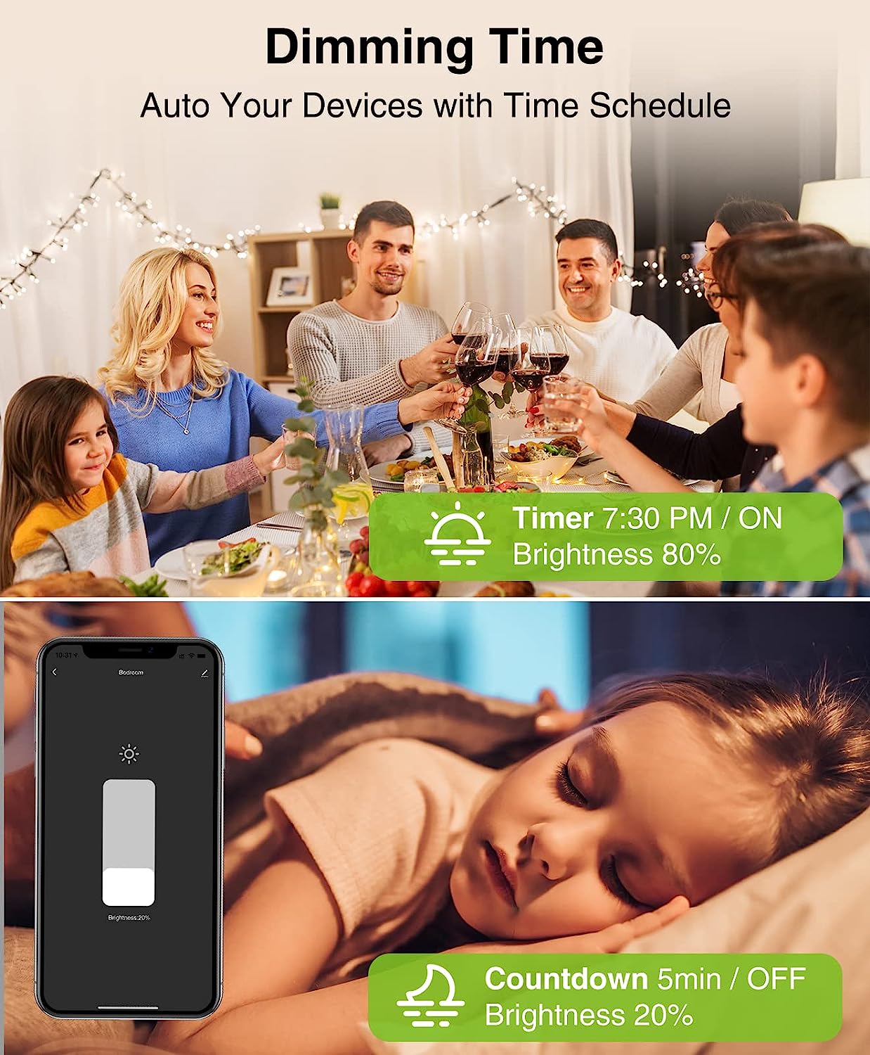 • Time Schedules - Set schedules to turn on/off electrical appliances while you are home or away. With the dimmer smart switch , you can create your personalized smart scenes to adjust your home lighting automatically to sunset and sunrise times.