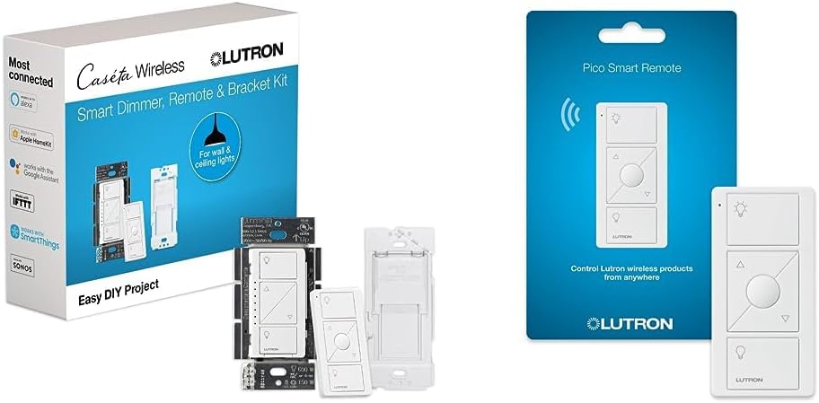 Experience the ultimate convenience with the Lutron Caseta dimmer, Pico remote control, and wallplate bracket. The dimmer gives you the ability to set the right light for any activity whether it's reading, watching TV, entertaining or having a casual dinner. Control the lights from anywhere in the room by using the Pico remote control either in your hand, on a tabletop pedestal (sold separately) or by mounting the remote directly to the wall with the included bracket. You can even use the Pico remote to control the lights from your car as you arrive home. The remote lets you turn lights ON/OFF as well as brighten or dim them. With the Lutron Caseta Smart Hub and app, you can control your Caseta dimmers with your smartphone from anywhere. The dimmer works up to 600-Watt of incandescent or halogen and 150-Watt of dimmable LED or dimmable CFL. Kit includes (1) Caseta dimmer switch, (1) Pico 3-button remote, and (1) Pico wallplate bracket. Wallplate not included, sold separately.