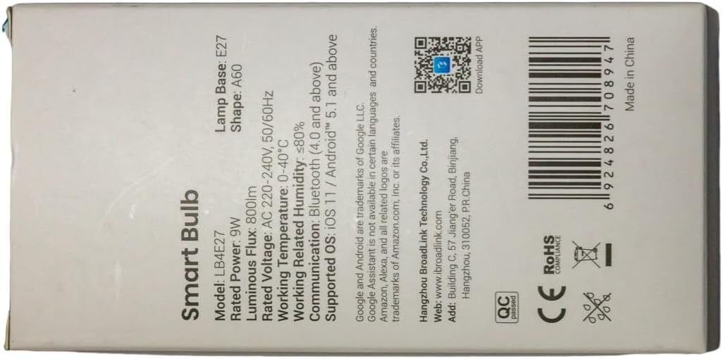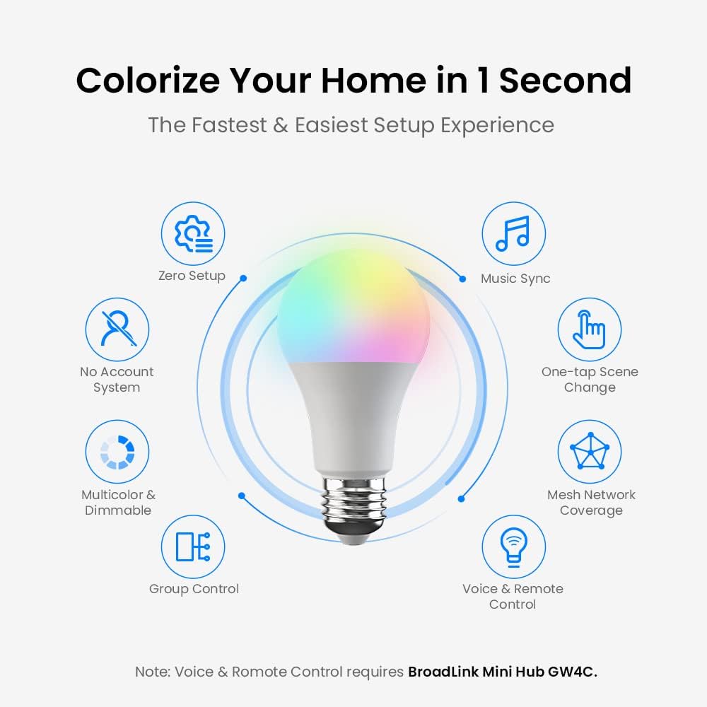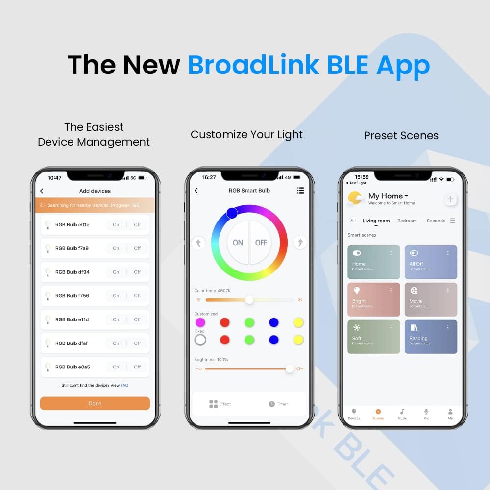 • 【Zero Setup】Download the new app – BroadLink BLE, power up the devices and wait them to be discovered in the App. Up to 90 devices can be added at the same time in 1 second. No need to create account. Fast and easy to use without privacy concerns. Supported by BroadLink exclusive technologies – FastCon and BLE. The Bulb is US Standard 110V.