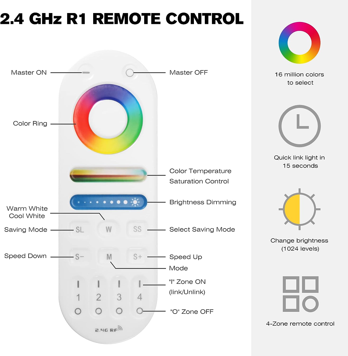• 【4-Zone GROUP SETTING & CONTROL】The R1 remote control can control 4 channels in the front at the same time, and one remote control can control countless lights or controllers. Realize whole house intelligence.