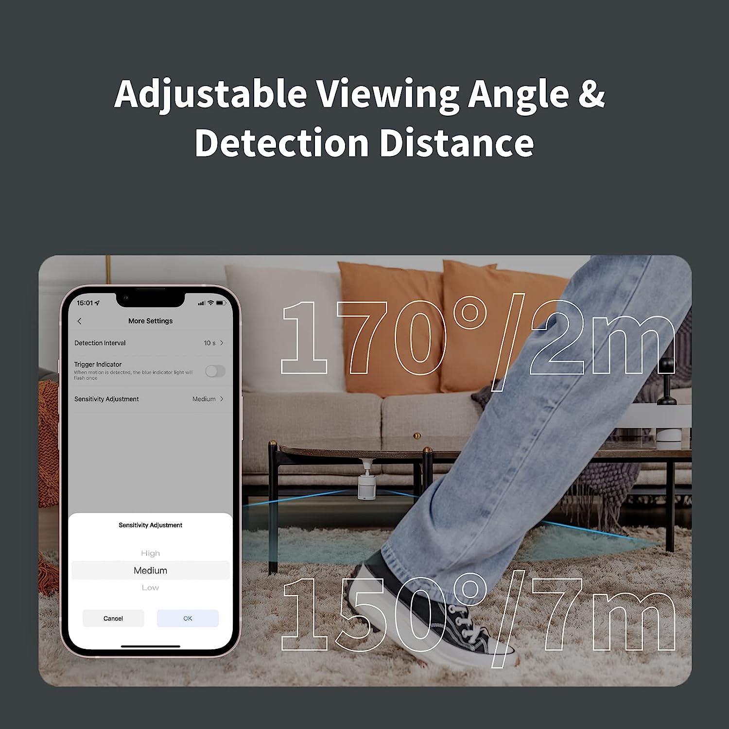 • [Adjustable Viewing Angle & Detection Distance] Extra-wide field of view: 170° for up to 4 meters and 150° for up to 7 meters. With a versatile 360° stand, you can easily adjust the viewing angle, and only trigger the sensor when it’s needed. Moreover, the three sensitivity modes (high, medium, and low) are configurable, and they refer to the distance the sensor will be triggered from.