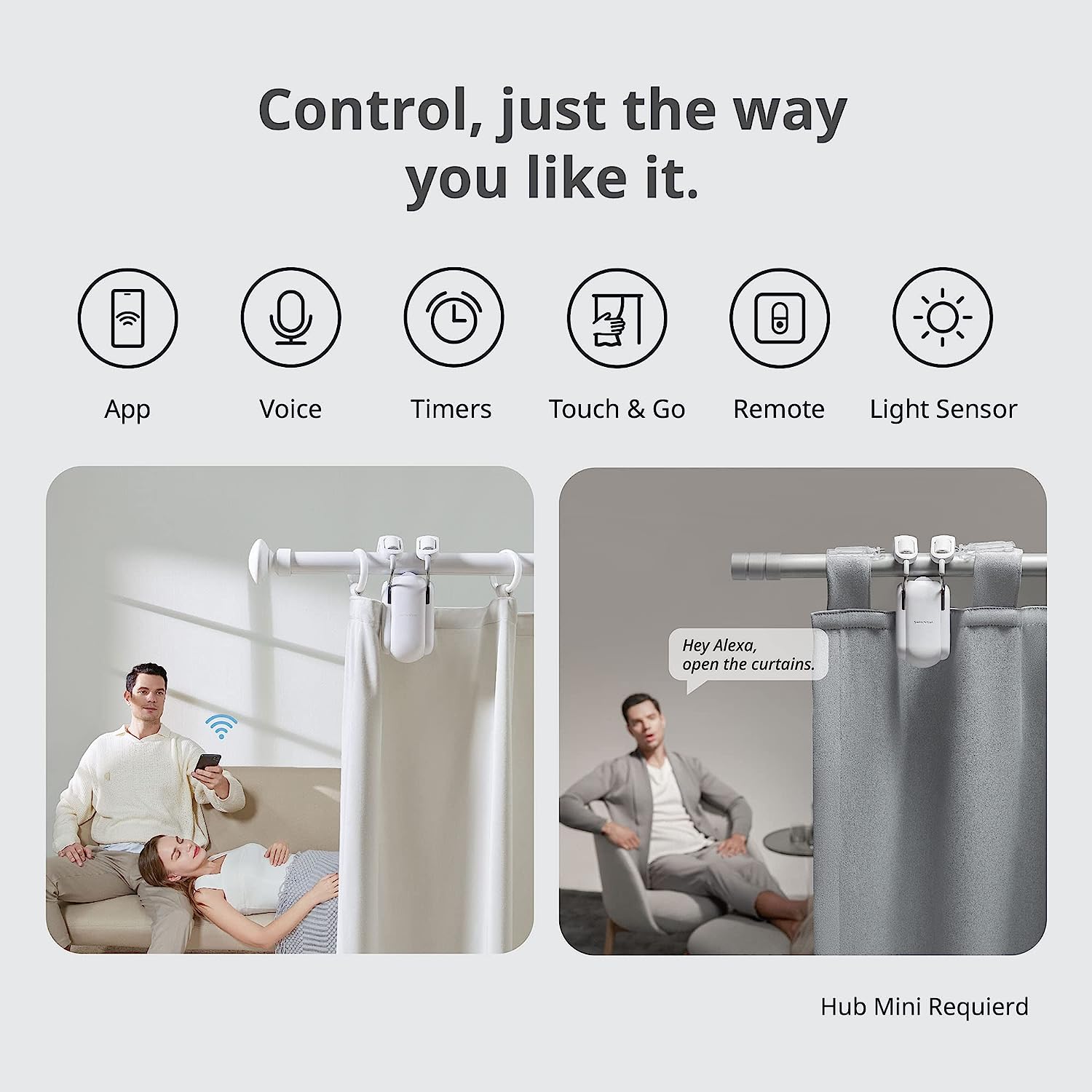 • Even Better With Smart Assistants - Use with SwitchBot Hub Mini/Hub 2(both sold separately), and SwitchBot Curtain can be compatible with Amazon Alexa, Google Assistant, Siri, IFTTT and others for even more home automation. Just say "Alexa/Ok Google/Hey Siri, let sunlight in" to open your curtains. Moreover, the smart curtain also supports Apple Homekit when add SwitchBot Hub 2.