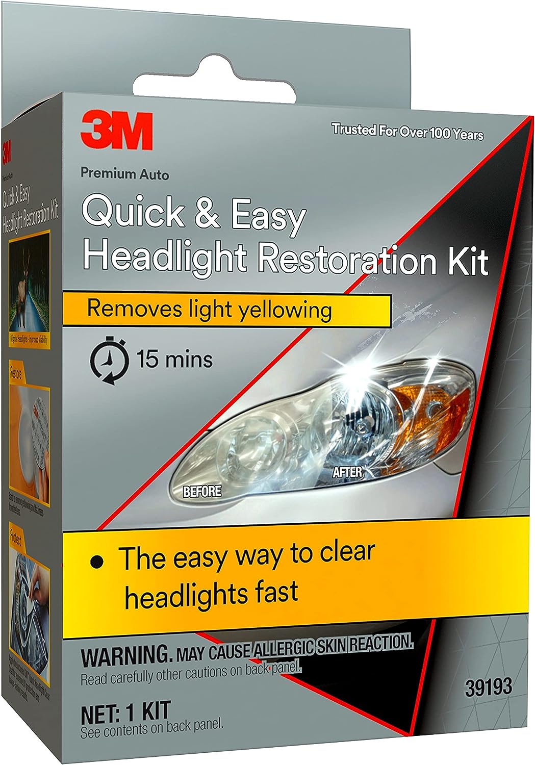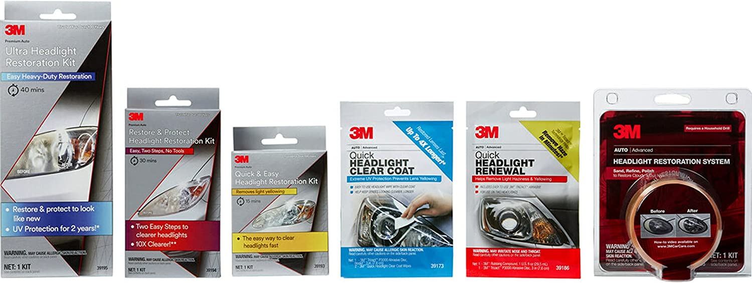 3M Headlight Lens Restoration Kit is a collection of professional-grade products assembled specifically for removing the cloudy, yellowed haze that builds up on automotive headlight lenses. Kits use a system of light abrasives to keep vehicles looking great and save money vs. replacing expensive lenses. They include complete directions, 3M Trizact sanding discs, pads and polishes.