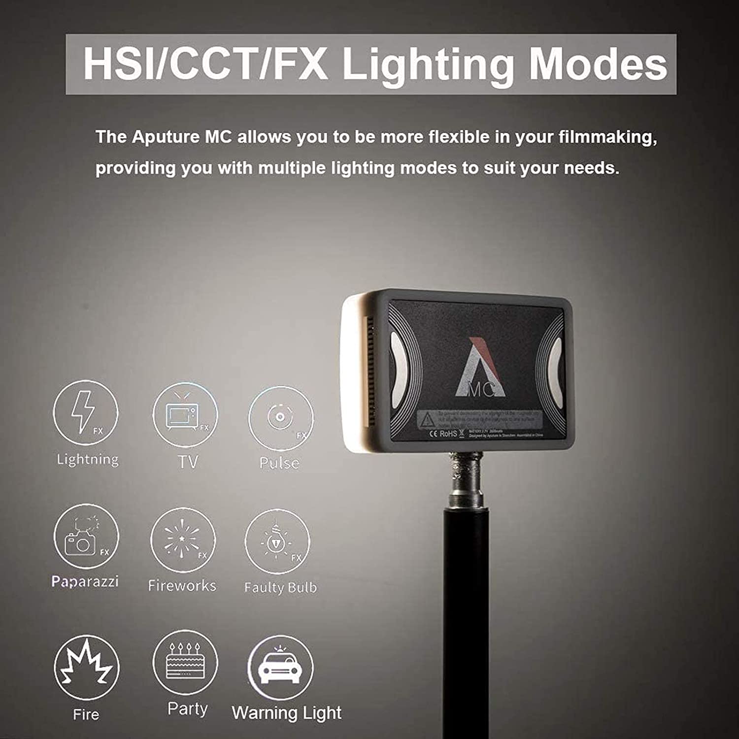 • The Aputure MC is Aputure's first RGBWW film light.HSI color control and a CCT range of 3200K-6500K,CRI and TLCI scores of 96+, and SSI scores of 84 in tungsten and 74 in daylight. With 360¡ã of hue and 100 levels of saturation adjustment.