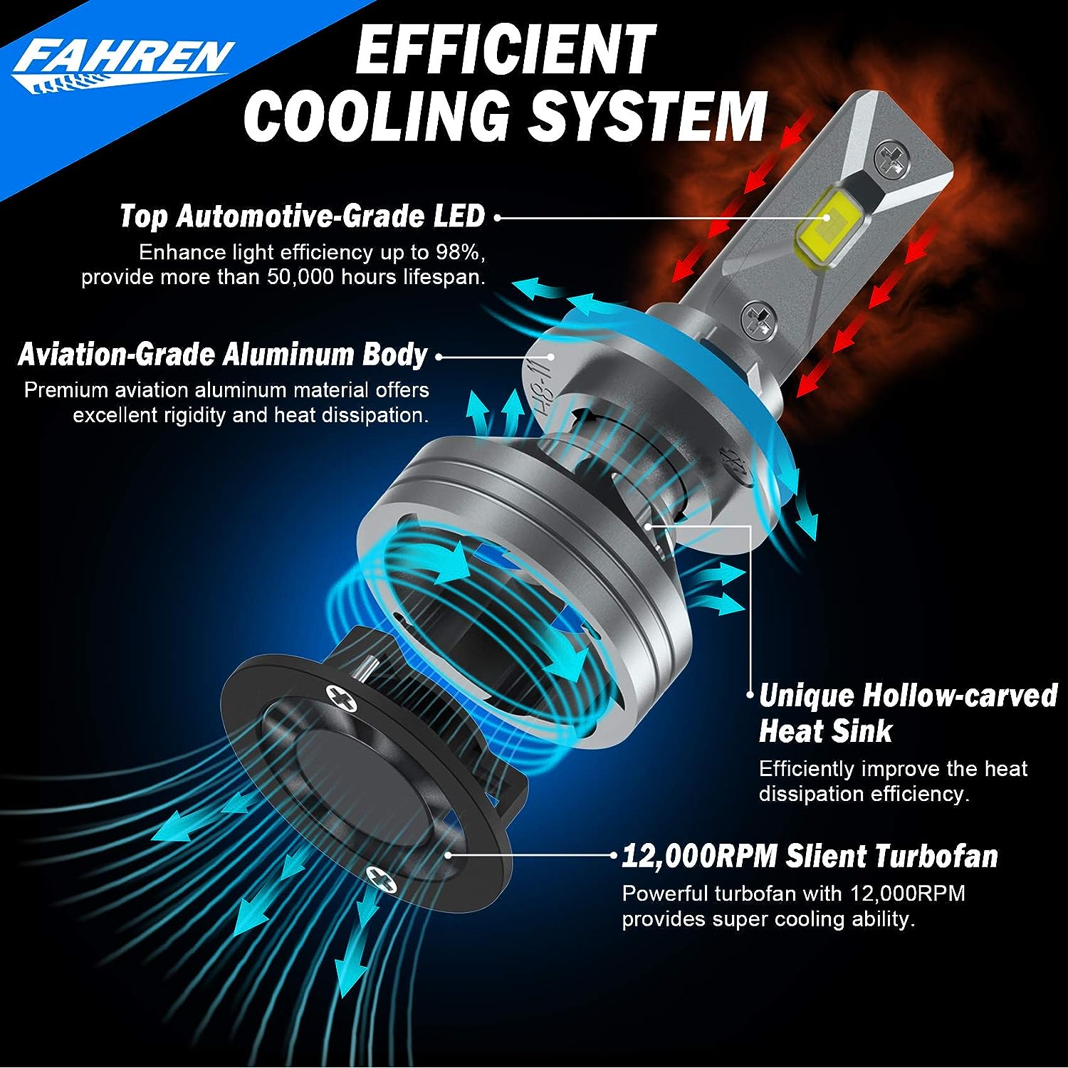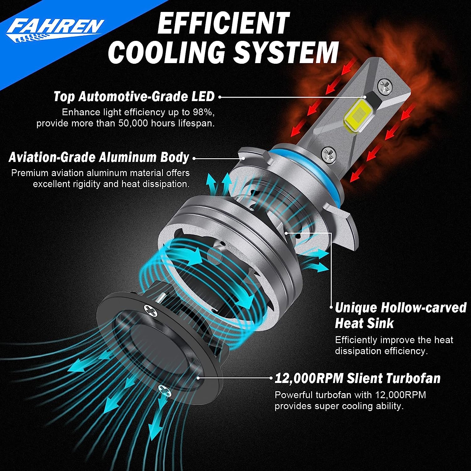 • 【Over 5,0000 Hours Lifespan】 - Whole aviation aluminum body, unique hollow-carved heat sink design and 1,2000RPM turbo cool fan provide super cooling ability, which ensures a longer lifespan up to 5,0000 hours.