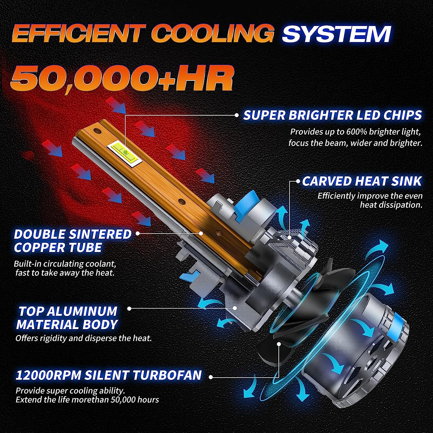 • OVER 50,000-HOURS LIFESPAN: Take aviation aluminum as the main body has a good heat dissipation, the carved heat sink designed and 1,2000RPM turbo cool fan provide super cooling ability. This 9005 LED headlight can ensure a life span up to more than 50,000 hours, reducing the need to replace the bulb and reducing the number of times you will be in the dark with a burnt out headlight.