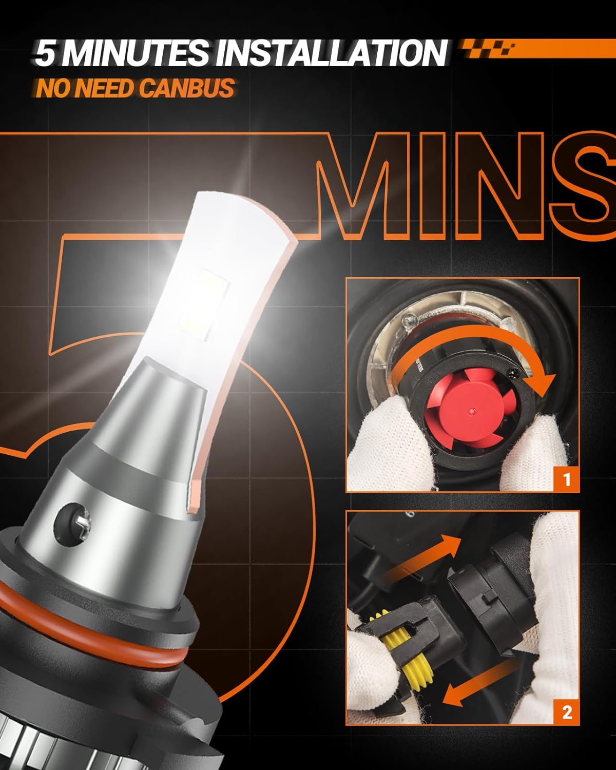 • Over 50000 hrs Lifespan: The aviation aluminum body, thermostatic copper plate, and 15,000 RPM turbo cooling fan can reduce the core temperature to below 220°F, preventing lights from going out during night driving, extending the average life of each headlight to 20 years, which takes the hassle out of frequent bulbs changes