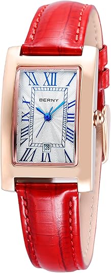 BERNY Rectangular Quartz Watch with for Women Classic Roman Numeral Markers Ladies' Casual Analog Wristwatch with Date Calendar Waterproof Genuine Leather Strap