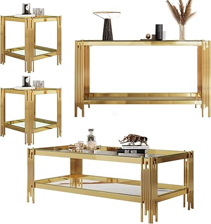 HomVent Living Room Tables Set of 4 for Living Room, Modern Design Living Room Glass Coffee Tables Set, Rectangle Coffee Table and 2 End Table Console Table Sets with Stainless Steel Legs