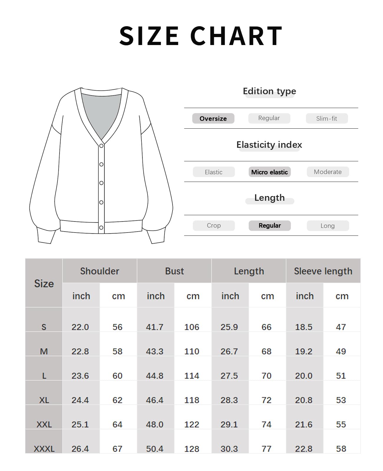Large - Shoulder: 23.6in./ Chest: 22.4in./ Length:26.0in./ Sleeve Length:20.9.