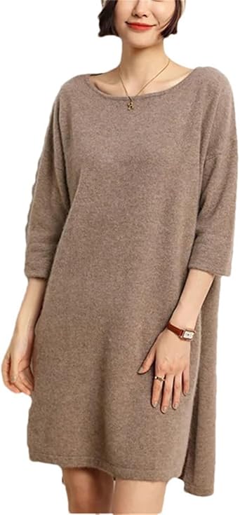 Women 100% Cashmere Knitted Sweater Dress, Sexy Loose Fit Long O-Neck Pullover for Autumn Winter