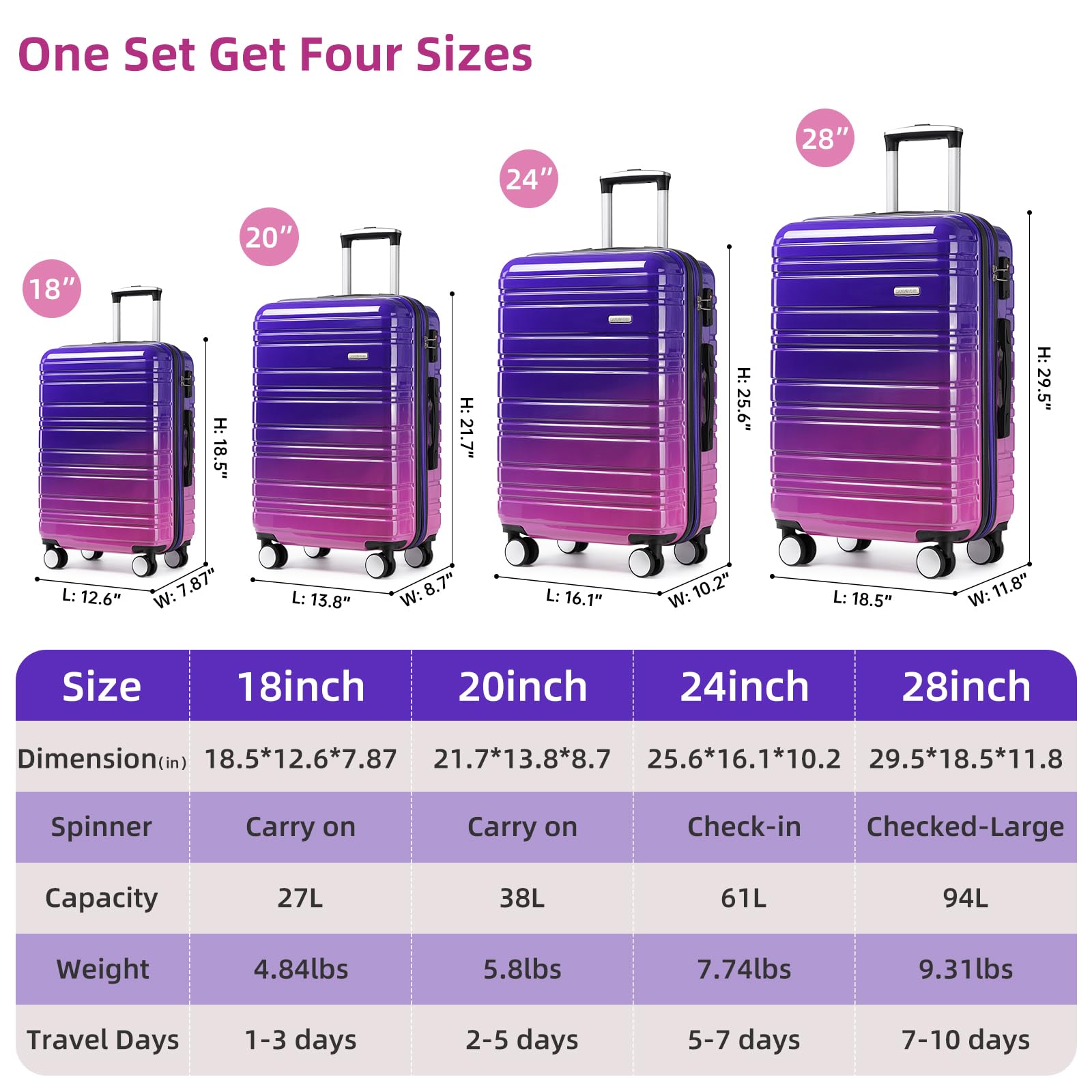 • 4 piece luggage set includes 18 inch, 20 inch, 24 inch, 28 inch, can be conveniently stored one into another.