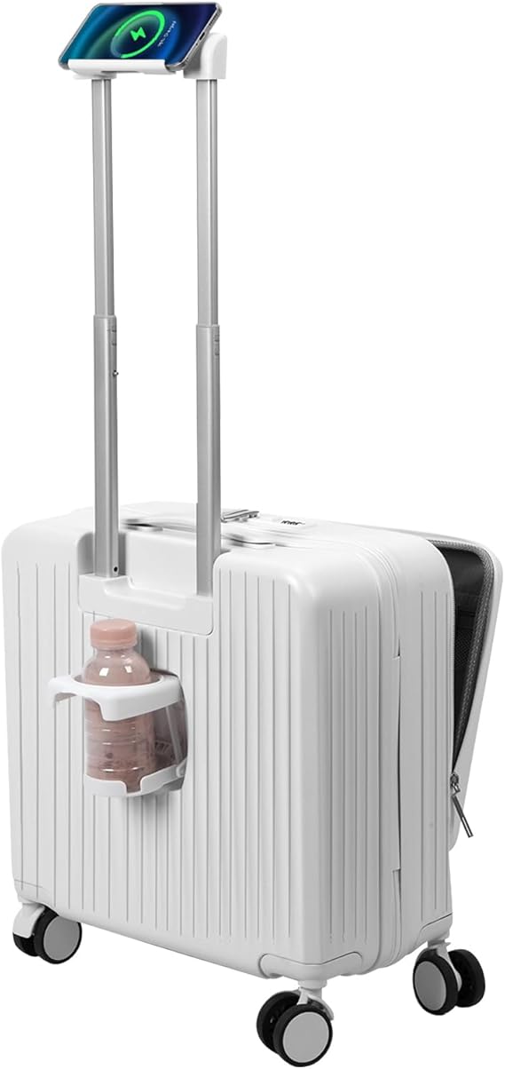 18 Inch Front Opening Luggage, Hard Shell Suitcase with Cup Holder, Phone Holder & USB Charging Port, Carry on Suitcases with Wheels for Travel White