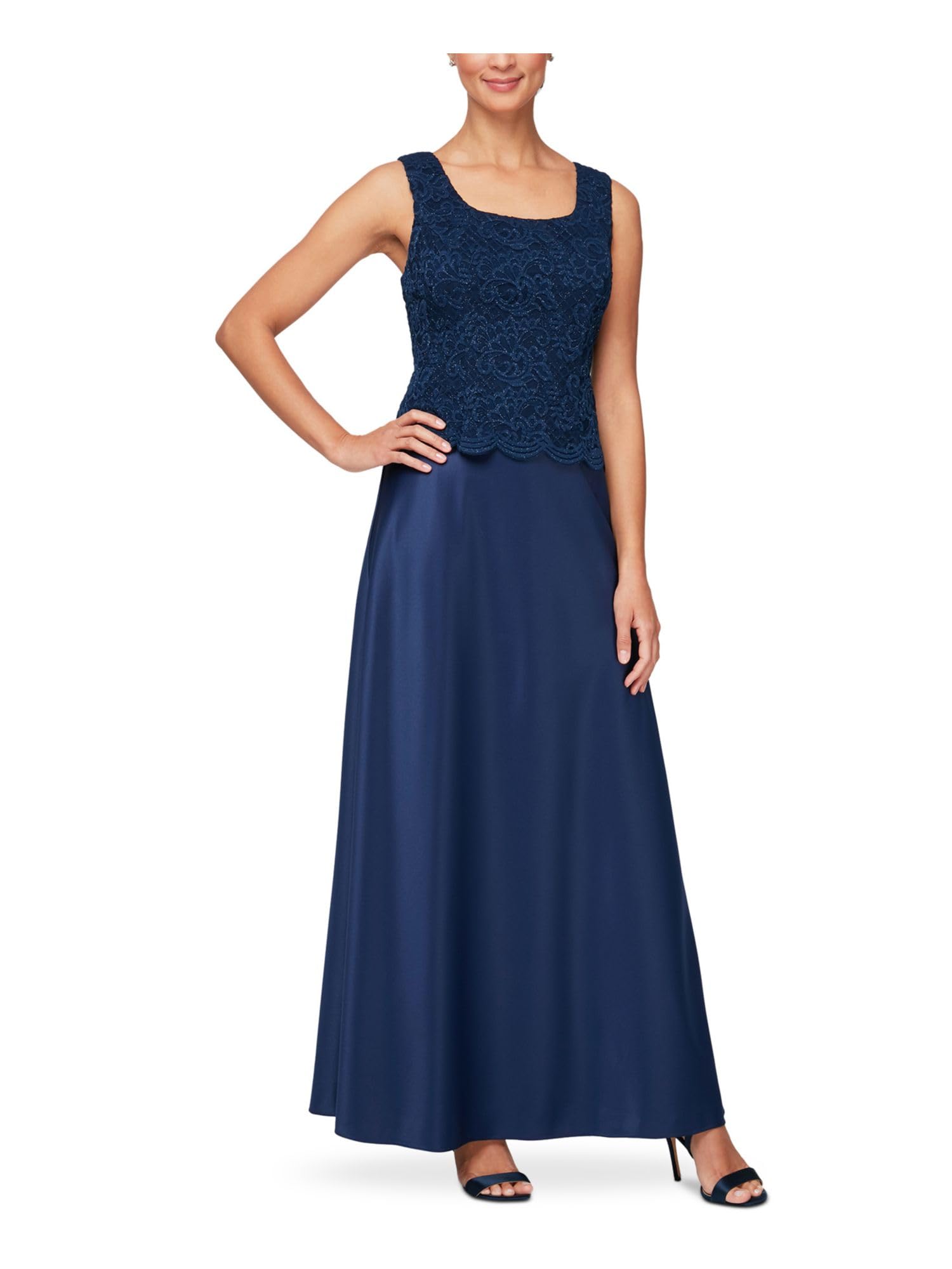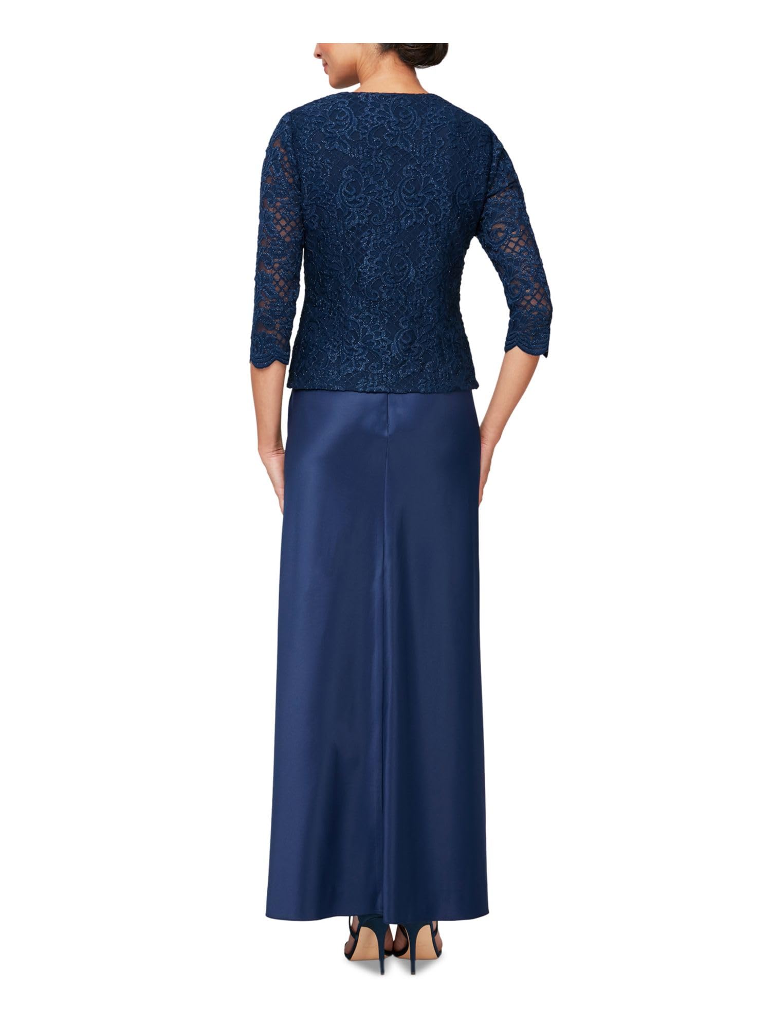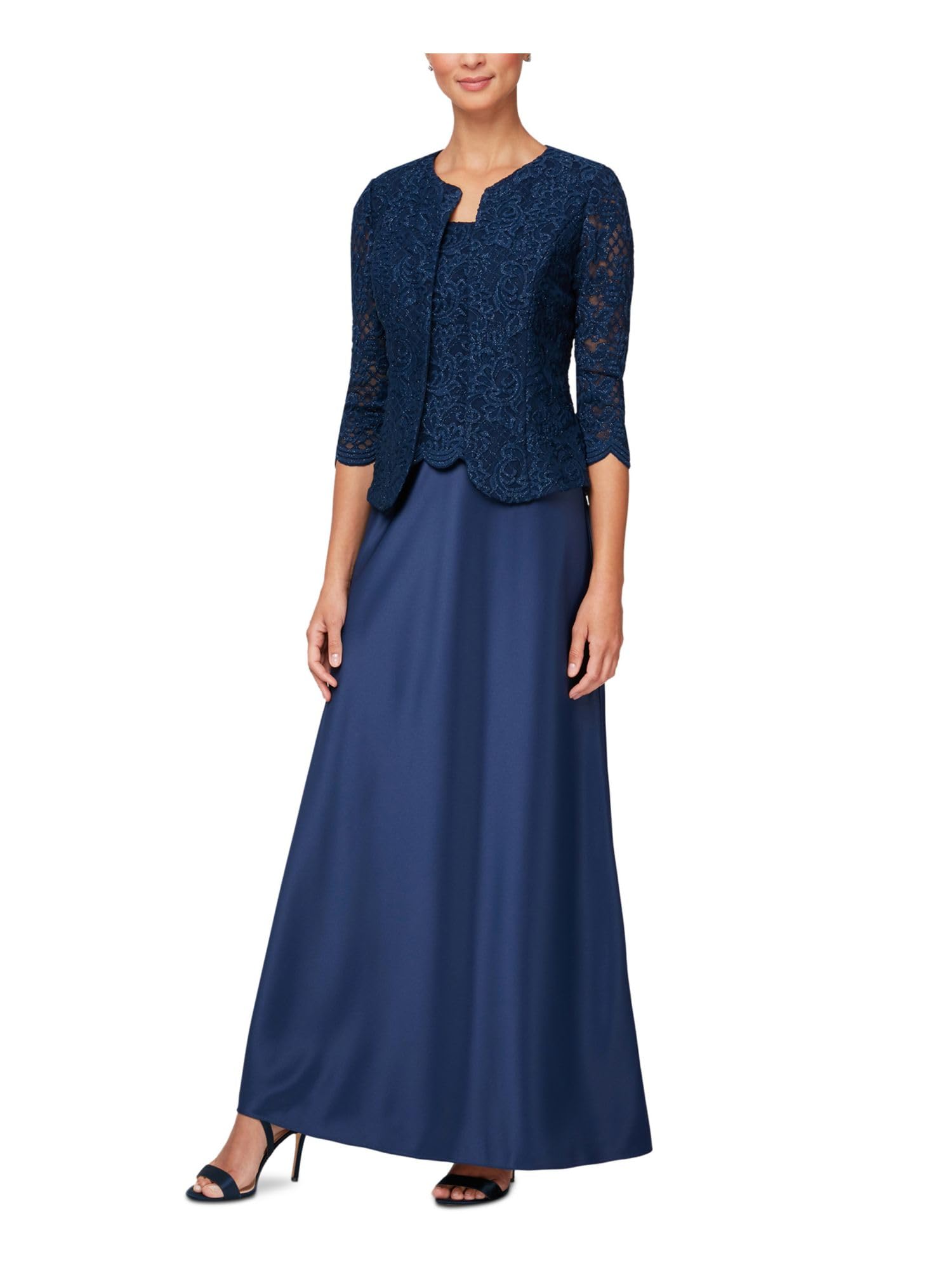 Details: Our long A-line mock jacket dress with scallop and sequin detail is great for a formal wedding. Perfect for a mother of the bride.
