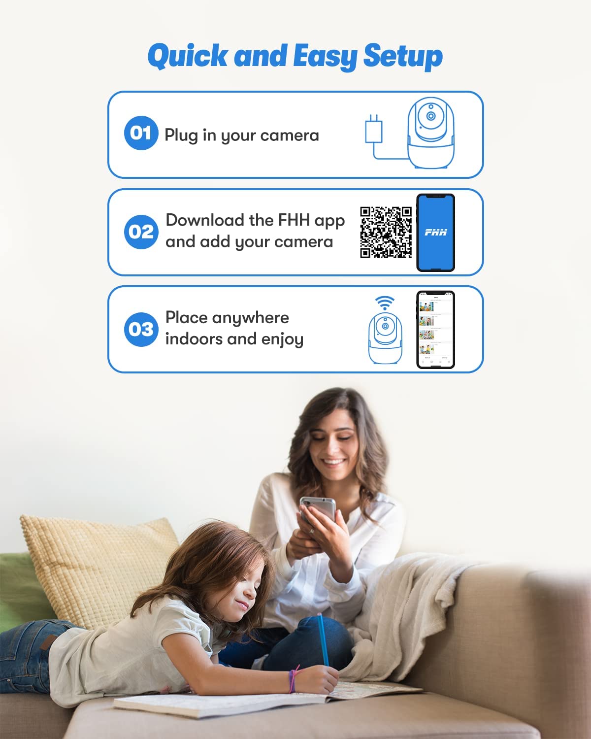 • Stylish & Easy to Set Up: Cameras and apps are easy to install, simple to control, and easy to maintain. Compatible with 2.4GHz WiFi network (𝗡𝗢𝗧 𝗦𝗨𝗣𝗣𝗢𝗥𝗧 𝟱𝗚ʜᴢ 𝗪𝗶-𝗙𝗶). Download FHH APP from App Store or Google Play.