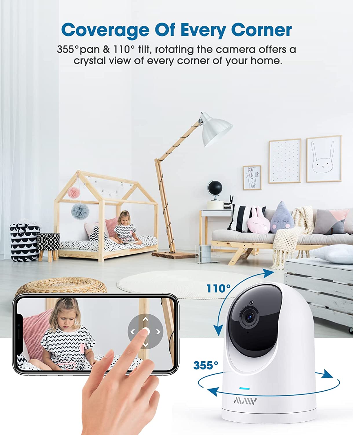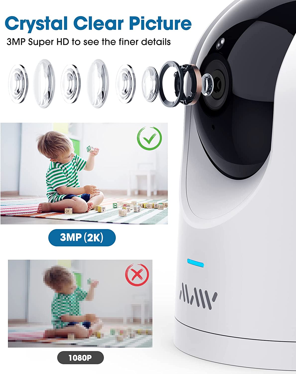 • 2K Resolution & 360° Coverage: Indoor cameras for home security provide 3MP super HD monitoring and recording. Turning the head of this security camera 355° horizontally and 110° vertically through the APP sees the whole picture of your home making this the perfect baby monitor, nanny cam, and pet camera.