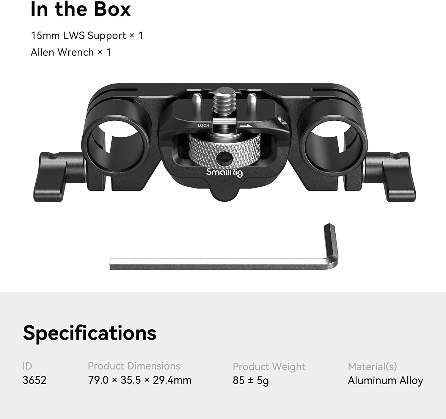 • Compatibility - SMALLRIG 15mm LWS Rod Support 3652 is an universal accessory for SMALLRIG Matte Box 3196/ 3680/ 3556/ 3641/ 3645, designed to fix matte box and protect lens mount