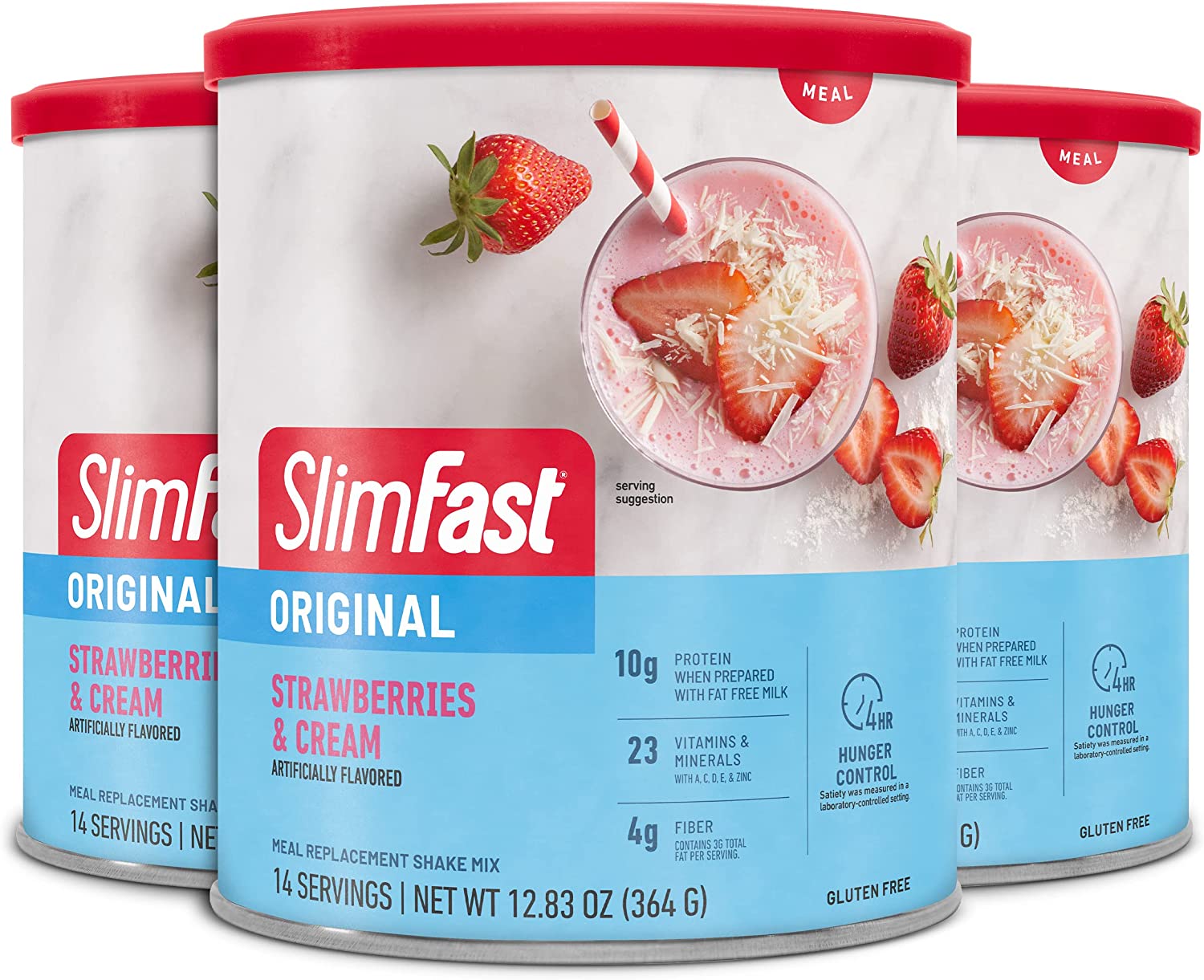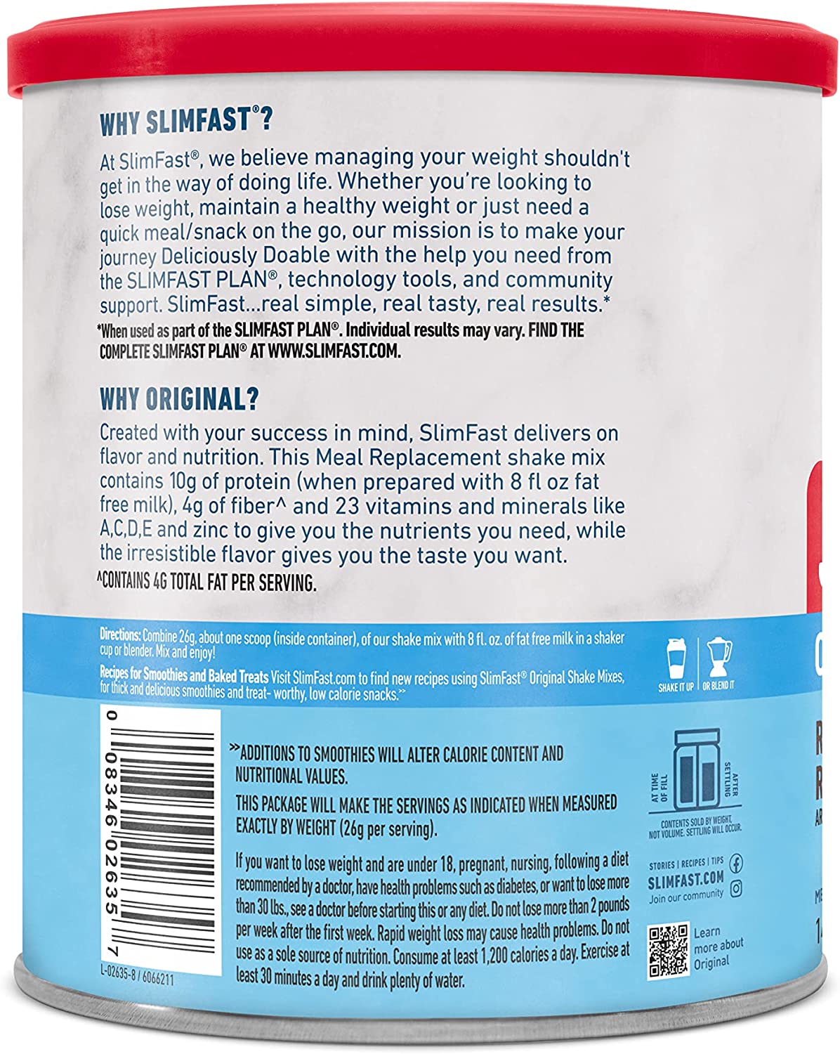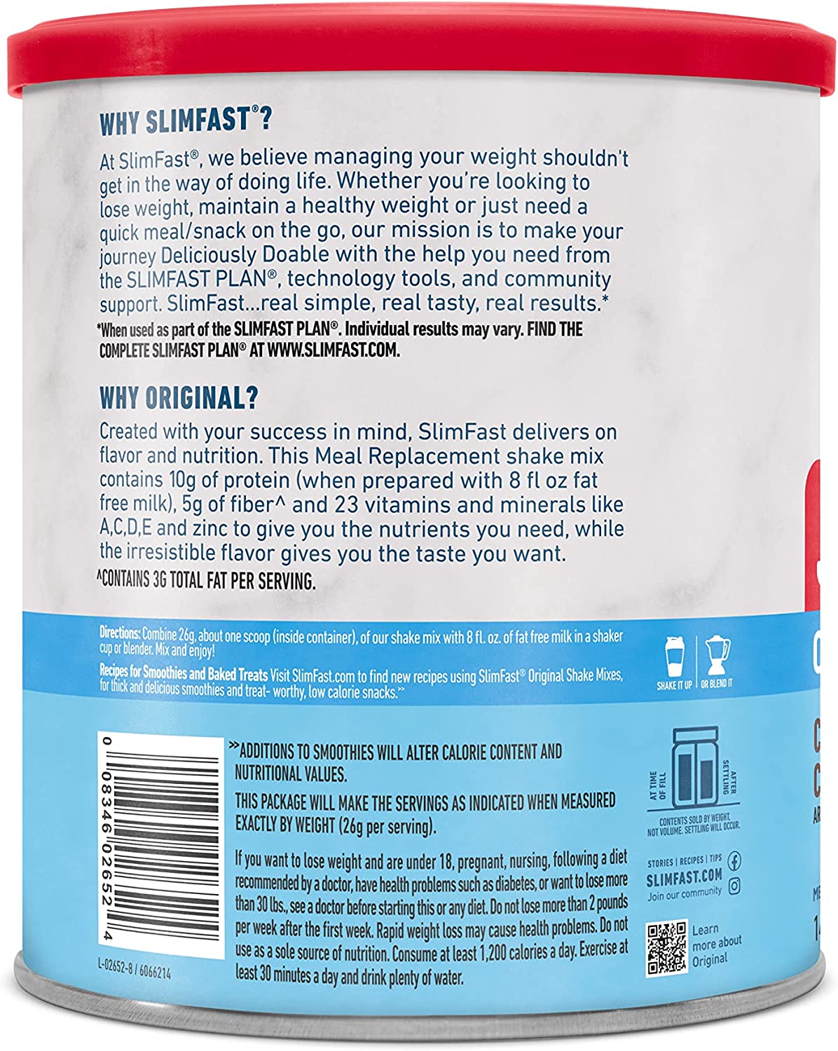 Losing weight is as easy as 1 – 2 – 3 when you activate the SlimFast Plan. One of the essential elements of this clinically proven weight loss program is replacing two daily meals with the great-tasting SlimFast Original Meal Replacement Shake Mix Powder. This meal replacement product that put SlimFast on the map is a great-tasting product that curbs hunger cravings for up to four hours. It contains 200 calories in each 8-fluid ounce serving, giving you plenty of energy to keep your body alert during the day. It is also packed with vitamins, protein, essential minerals, and fiber. This meal replacement shake mix by SlimFast contains 10 grams of protein along with 4 grams of fiber and 24 essential vitamins and minerals that help your body process and burn stored fat, making it easier for you to lose weight.