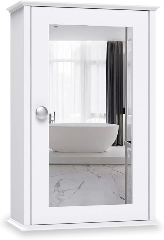 Bathroom Medicine Cabinet with Mirror, Wall Mounted Recessed Storage Cabinet with 1 Door & 3 Position Adjustable Shelves, Wooden Mirror Cabinet for Bathroom, Living Room, Entryway (White)