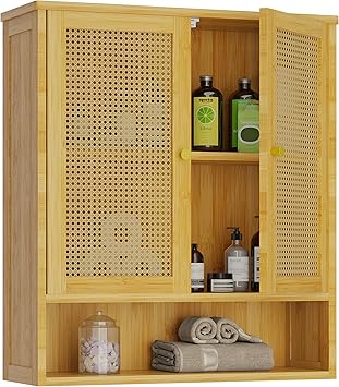 Bathroom Wall Cabinet, Bamboo Medicine Cabinet with 2 Rattan Doors and Adjustable Shelf, Over The Toilet Storage Organizer, Natural Cabinet Wall Mounted for Bathroom, Laundry Room, Hallway