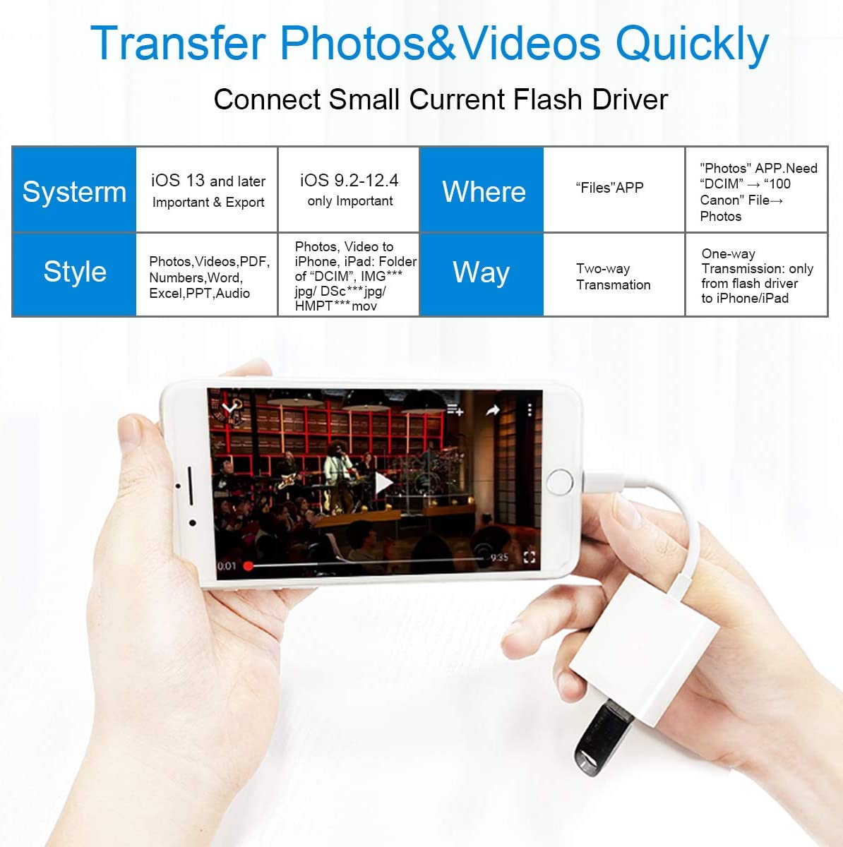 • Compatible Device: This adapter compatible with multiple devices, such as iPhone 11/Xs/Xs Max/X/8/8 Plus/7/7Plus/6/6 Plus/5/5S/SE and iPad Air /Mini /Pro (under folder:DCIM. The iPhone 7 and later models can read 4K video.) Support iOS 9.2- iOS13 and before - No APP Needed.